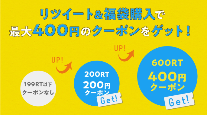 ①Twitterの「夏の福袋」が販売予定のお知らせをリツイートするだけで、福袋購入者全員に「最大400円クーポン」プレゼントの大チャンス!