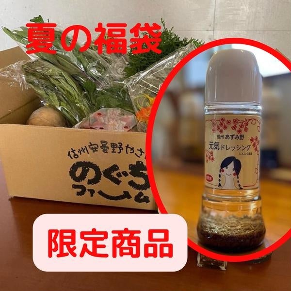 のぐちファームのハーフセット野菜に農園からすぐ近くのクエルドノメルさんの手作りの元気ドレッシングをセットにした夏の福袋限定商品となります。