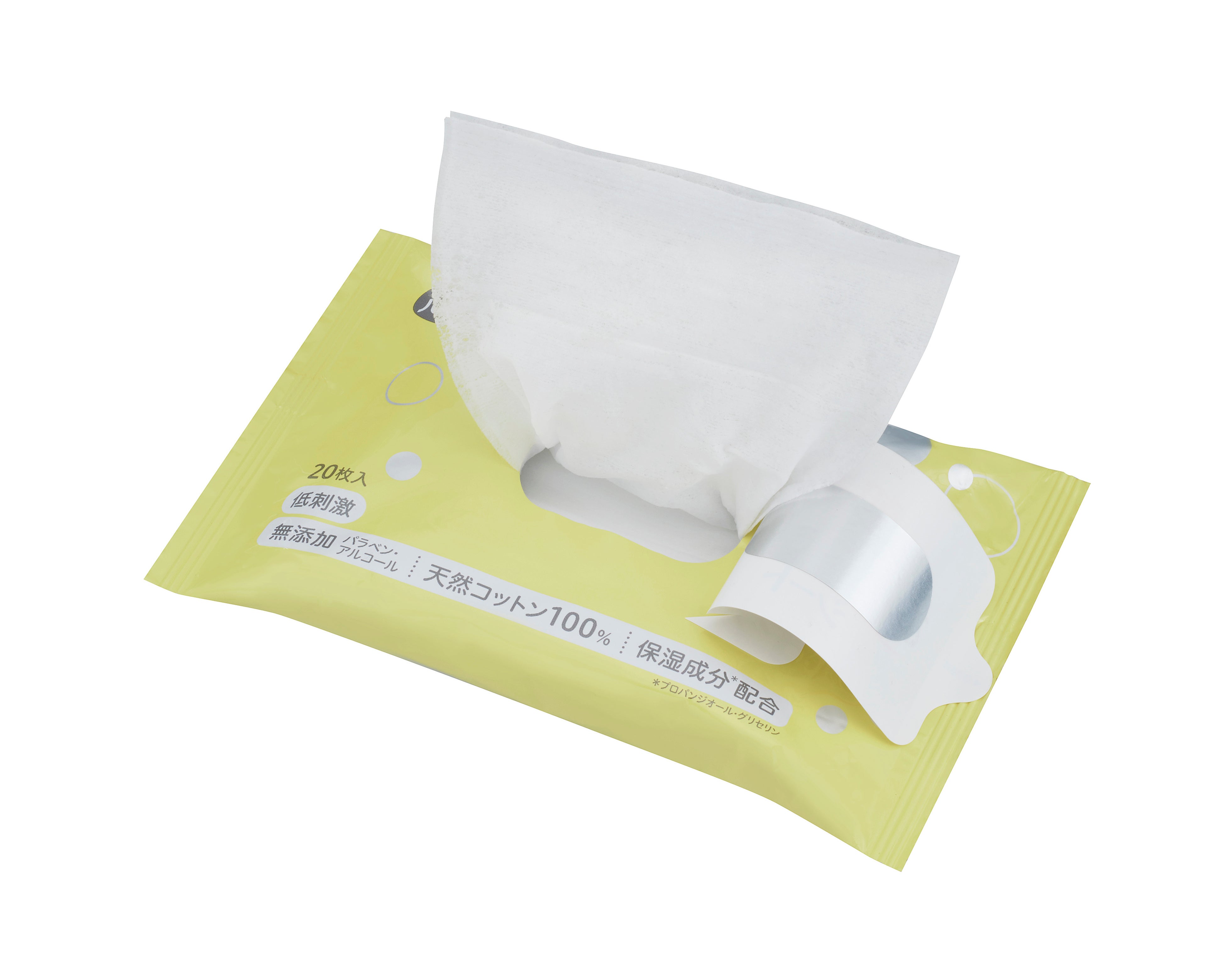 身体の皮膚と比べ薄くデリケートなお顔を拭く専用品である本商品は、無添加(パラベン・アルコール)で低刺激なシートを採用。また、天然コットンを100%使用しているため、やわらかな肌触りです。