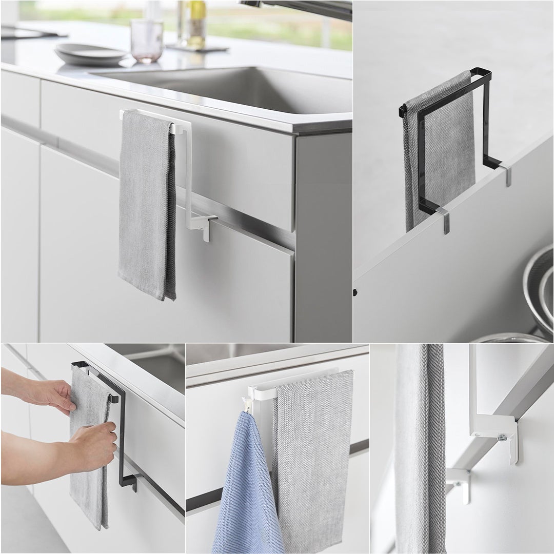 キッチンのシンク下扉に高さ15cmのタオルハンガーを簡単設置。