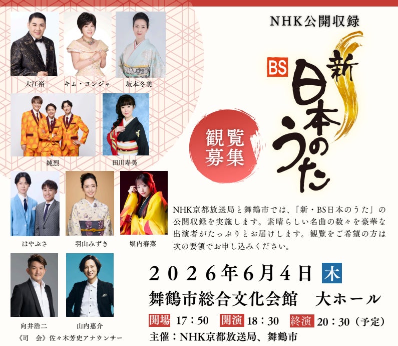 舞鶴市は、NHK京都放送局との共催により、令和8年6月4日(木)に舞鶴市総合文化会館にて「新・BS日本のうた」の公開収録を実施いたします 。演歌・歌謡界を代表する歌手によるステージの観覧申し込みを受け付けます。