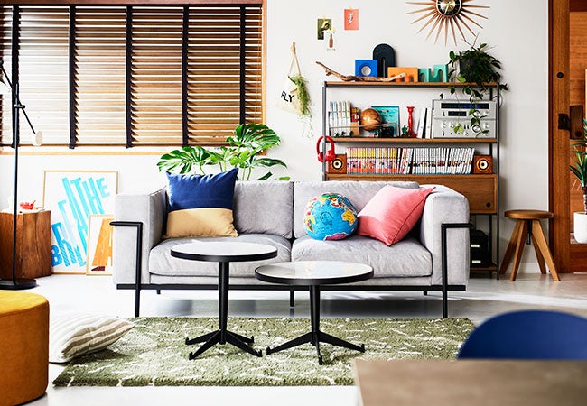 リビングシーンは、モダンかつシャープなデザインの「ボトックスソファ」に、大理石を使った「ストーンズテーブル」を合わせて、さらに木材を使用したシェルフを組み合わせることで、無機質になりすぎずミッドセンチュリーを感じさせるスタイリングに仕上げました。