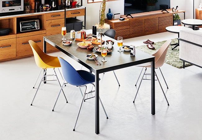 ダイニングシーンは、「モダン」「無機質」「モノトーン」をイメージ。近年人気が高まっているセラミックテーブルに、ミッドセンチュリーのアイコン的アイテムをイメージした「エッグチェア」を合わせた、遊び心のあるポップな色使いのコーディネートです。
