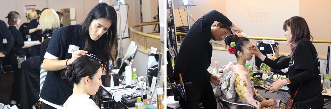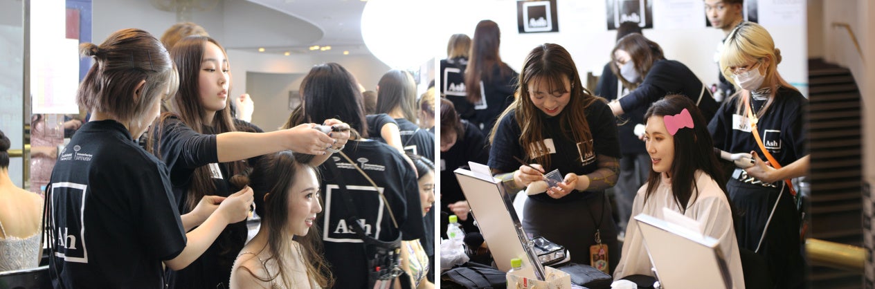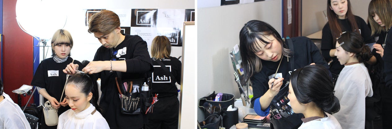 11月28日に行われた日本大会では、出場者32名のファイナリストのヘアアレンジとメイクをAshの美容師が担当しました。着物とイブニングドレス、それぞれの衣装に合わせてヘアとメイクの両方を手掛けます。衣装チェンジの合間の限られた時間で、舞台上で活躍する出場者の方々の魅力を最大限に引き出すようヘアメイクを施しました。仕上がりのクオリティはもちろんのこと、一人ひとりが自信を持ってステージに立てるよう美容技術を通じて精神面でもサポートできるように努めました。