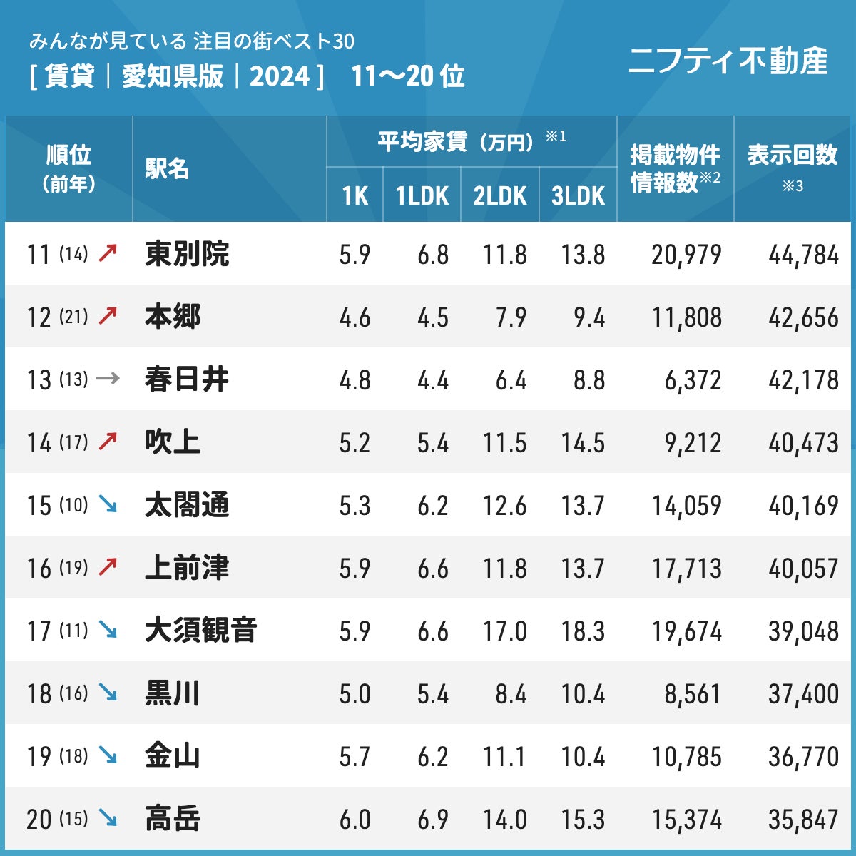 今回は、東海エリアから愛知県で賃貸物件を探しているユーザーからの検索・閲覧数が最も高い、注目の街ランキングベスト30(2024年)を発表いたします。