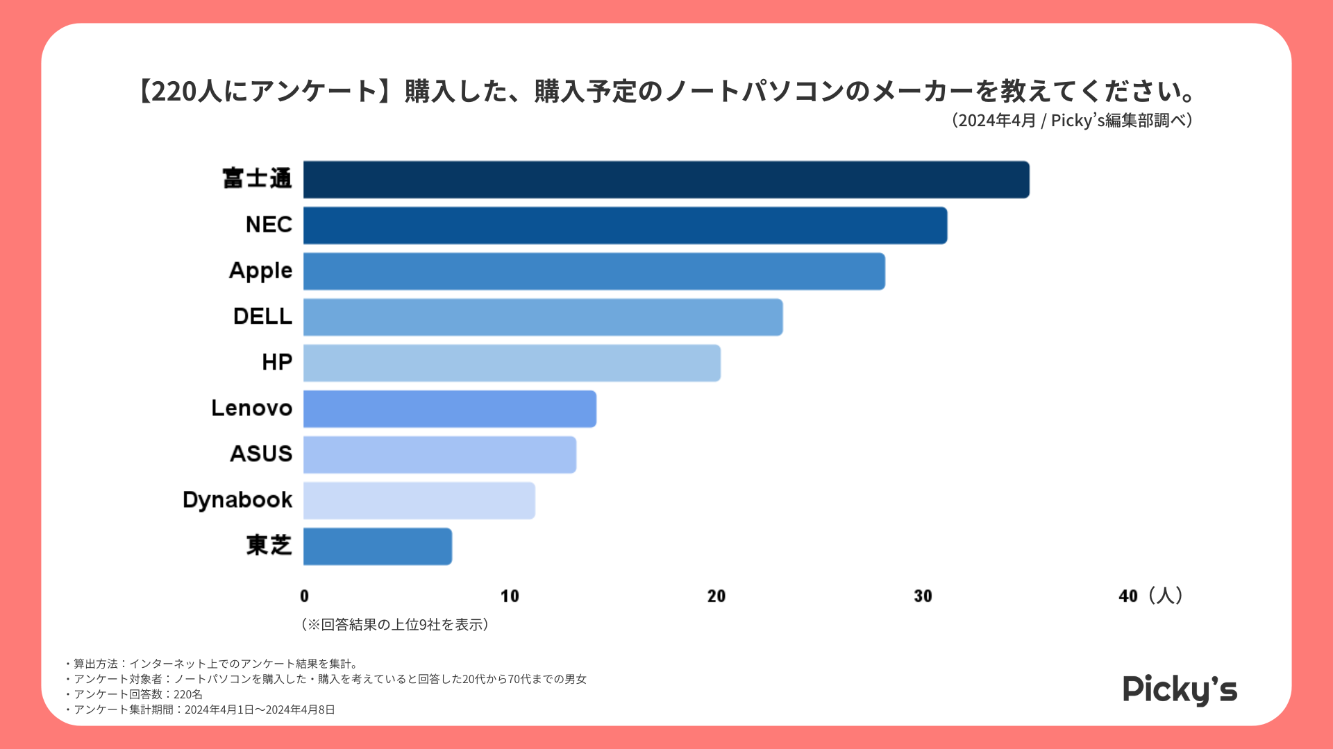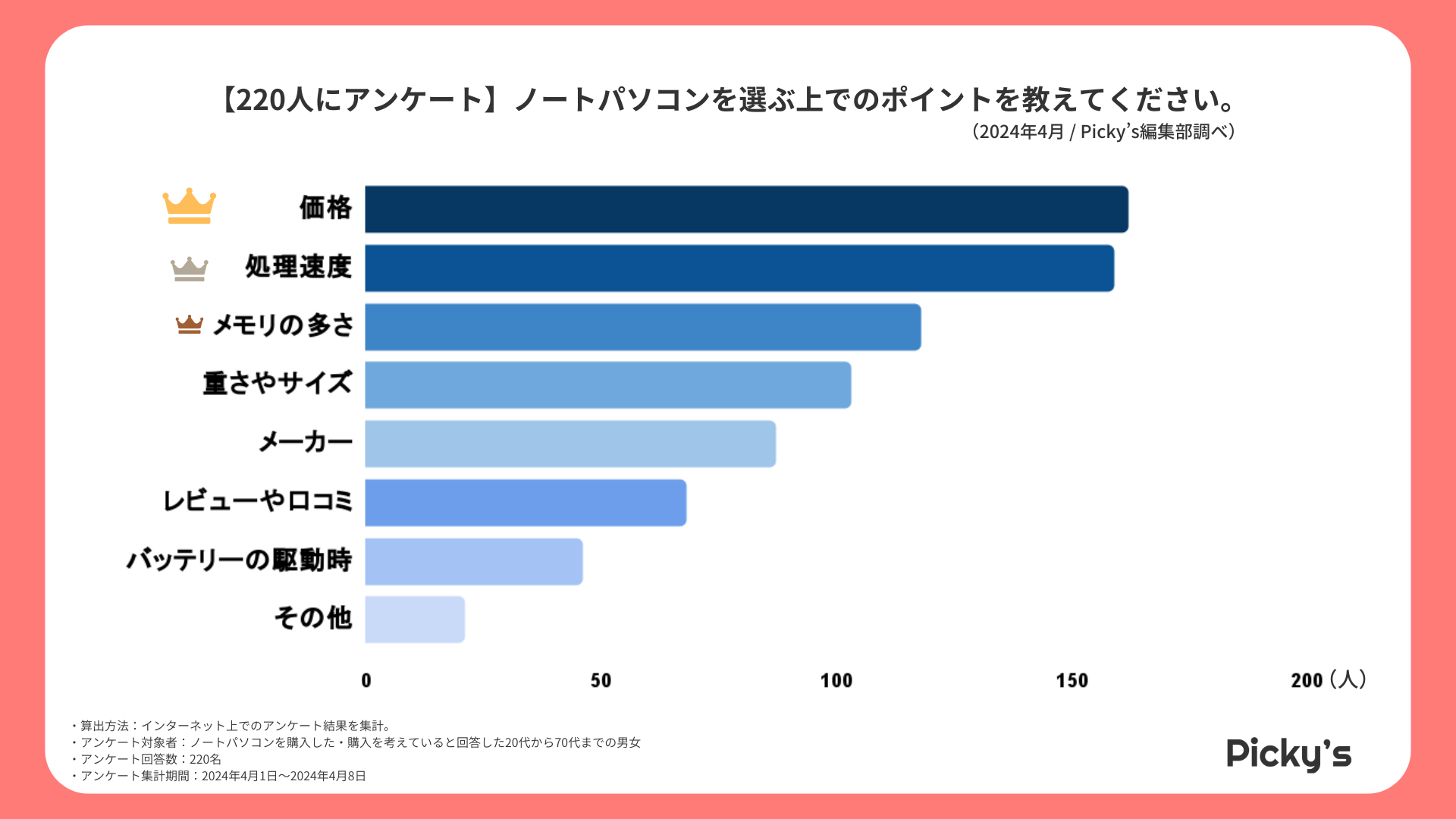 「Picky’s」は、インターネットショッピングにおいて、購入前に試せない・選ぶべきものがわからないという課題の解決を目標に、あらゆる商品のおすすめランキングや検証レビューを紹介するサイトです。このたびPicky’s(https://rentry.jp/)では、ノートパソコンについてインターネット上でアンケート調査を行いましたので発表いたします。