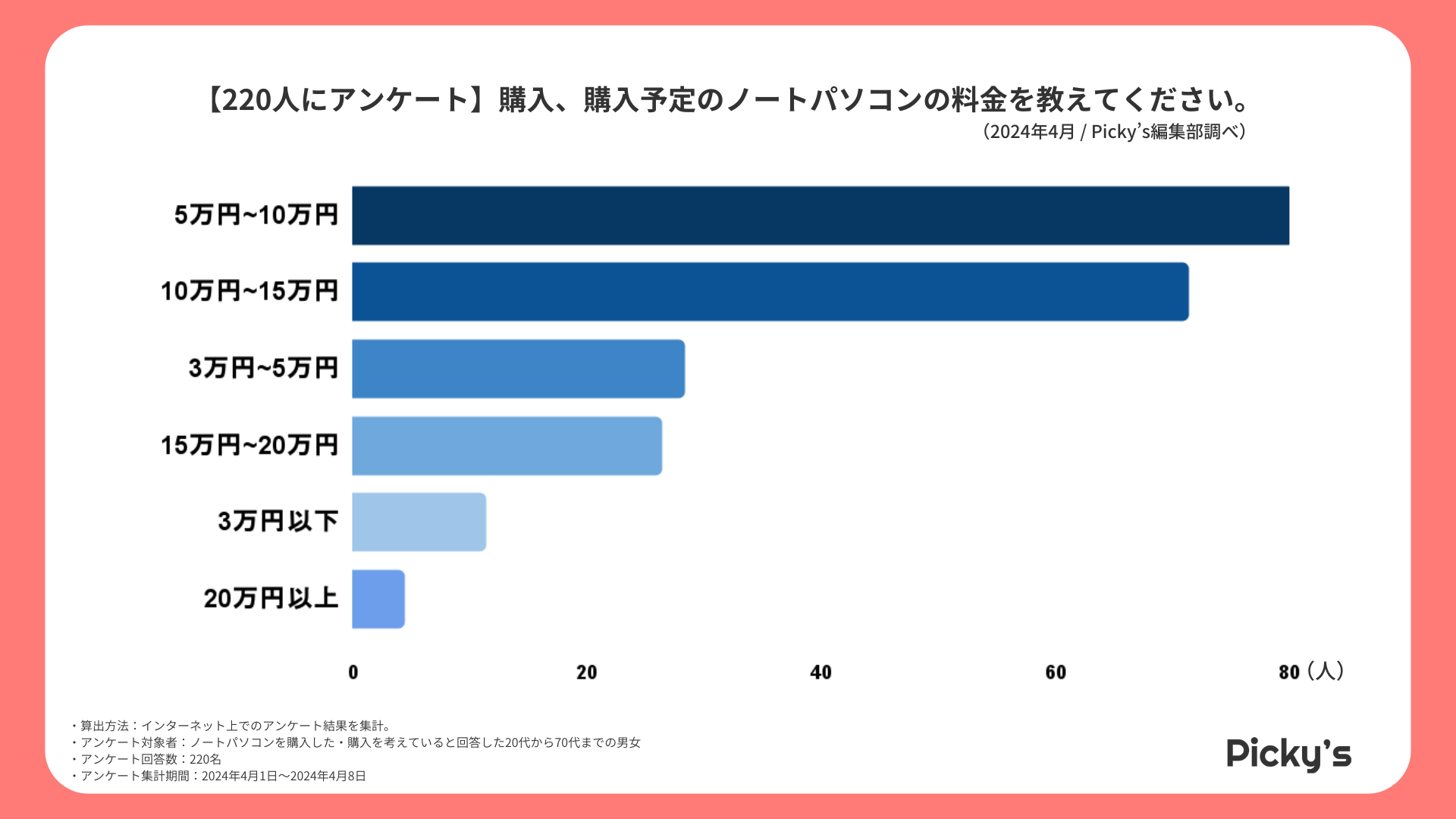 多くの人が「5万円~10万円」の価格帯を選んでいることが分かります。この価格帯は、比較的手頃な価格で性能のバランスが良いモデルを選びやすいため、人気があるのではないでしょうか。