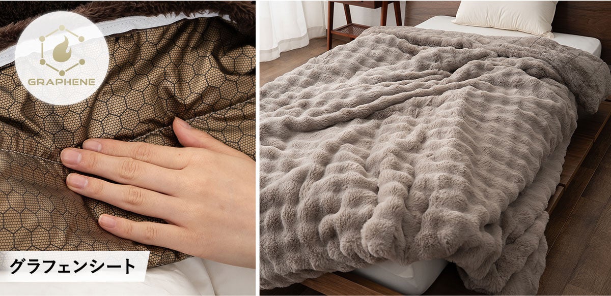 グラフェンは、銅の約10倍の熱伝導率で蓄熱保温性に優れた素材。体温を循環させ、布団の中を暖めてくれます。また、炭素からなるグラフェンは、抗菌・防臭効果にも優れており、ニオイの元になる雑菌の繁殖を抑える効果が期待できます。