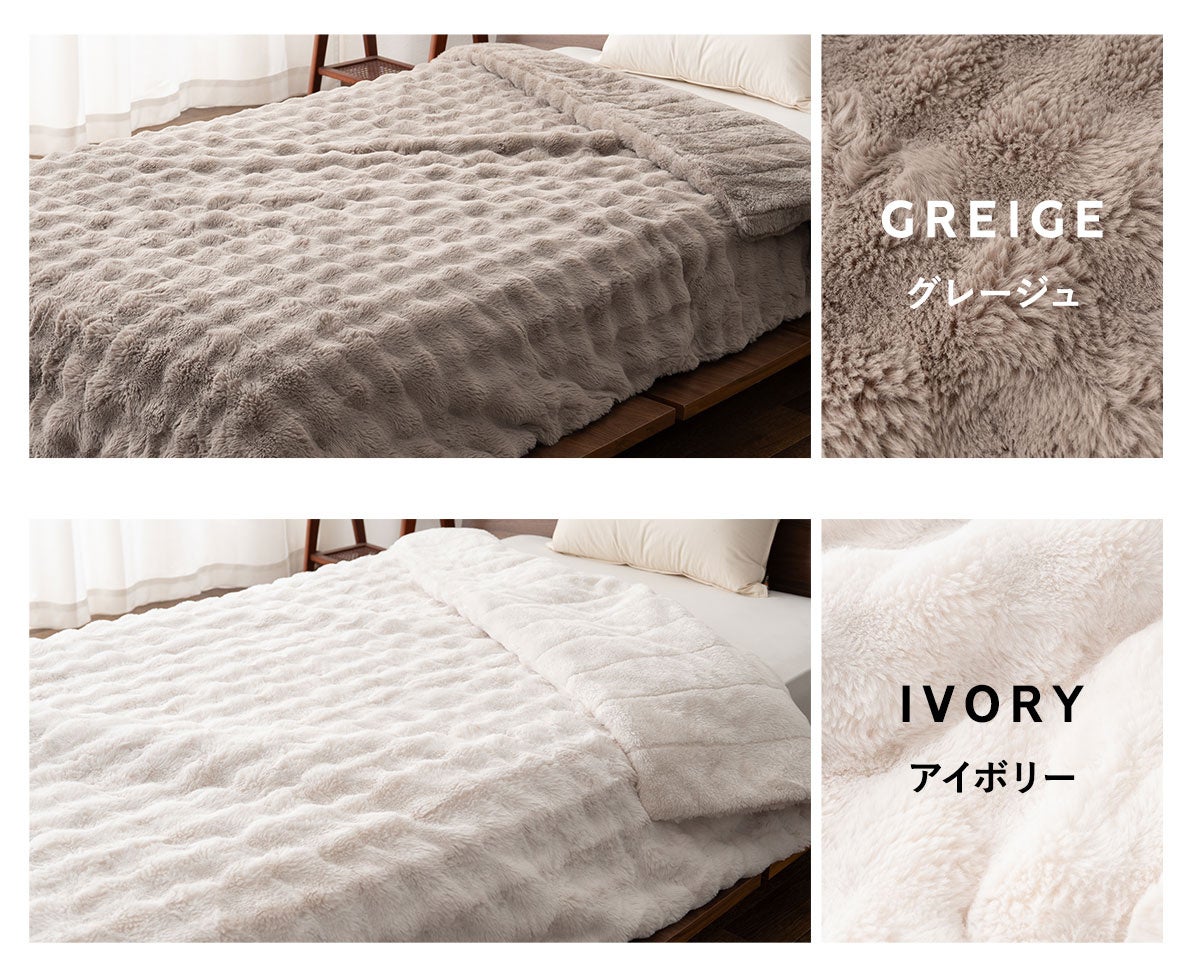 天然繊維の特性を再現した、ふわふわのロングパイルが空気をたっぷり含み、暖かさを逃しません。既製品の約1.4倍の目付けで、たっぷり目が詰まってふかふか。毛が抜けにくい作りです。
