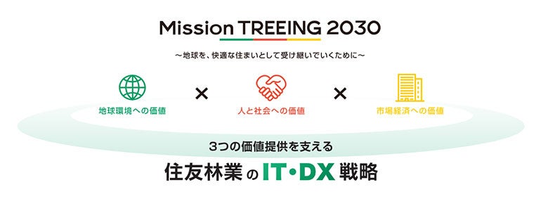 住友林業グループは長期ビジョン「Mission TREEING 2030」の事業方針の一つの「変革と新たな価値創造への挑戦」でデジタル、イノベーションをキーワードとしており、DX推進を長期ビジョン達成に向けた重要な取り組みと位置づけています。地球環境、人々の暮らしや社会、市場や経済活動への価値提供を通し、将来世代を含むあらゆる人々やすべての生き物に、地球が快適な住まいとして受け継がれていくことを目指します。人とデジタル技術で「森」と「木」の価値を活かし、深め、新たな未来の力へ変えていきます。