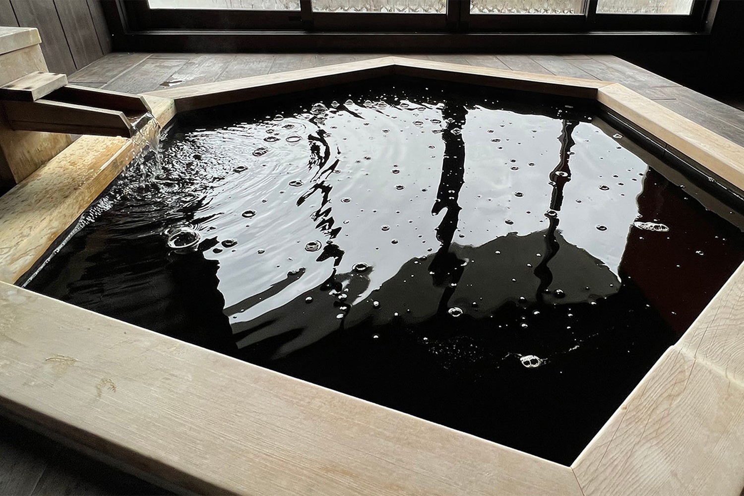 ⑤秘境の天然温泉を贅沢に楽しむ 源泉100%。希少な黒色の天然自噴温泉
