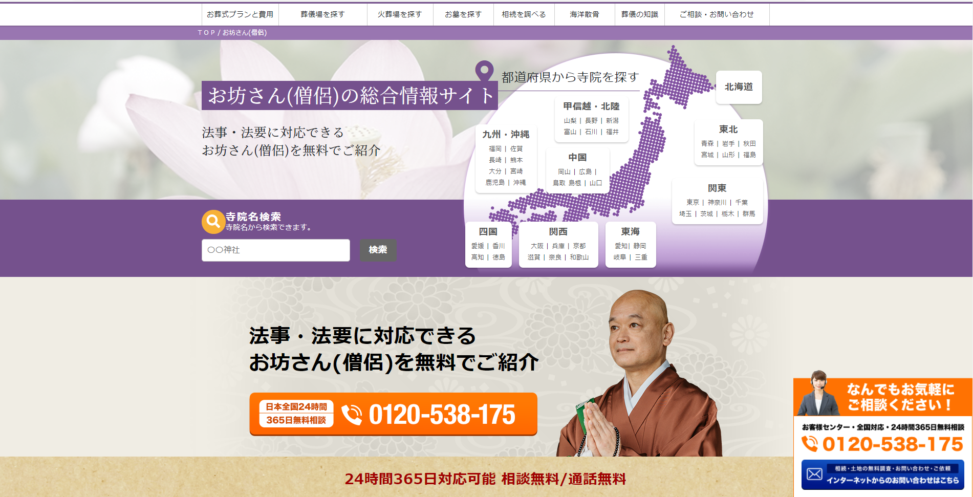 ①主要八宗全国対応全国で1,500名以上の僧侶と提携