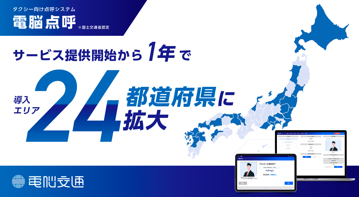 タクシー・交通業界のDXを推進する株式会社電脳交通 (本社:徳島県徳島市、代表取締役社長:近藤 洋祐、以下「電脳交通」)は、クラウド型点呼システム「電脳点呼」の導入エリアがサービス提供開始(※)から約1年で24都道府県に拡大したことをお知らせいたします。
