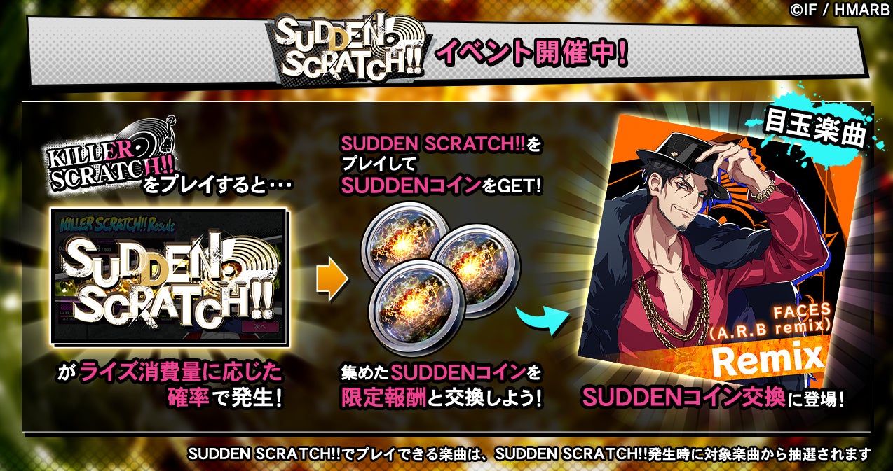 イベント期間中、KILLER SCRATCH!!をプレイするとライズ消費量に応じた確率でSUDDEN SCRATCH!!が発生します。SUDDEN SCRATCH!!をプレイすると、通常の報酬アイテムの他、限定アイテム「SUDDENコイン」を獲得することができます。「SUDDENコイン」を集めることで、新楽曲「FACES(A.R.B remix)」と交換することが可能です。
