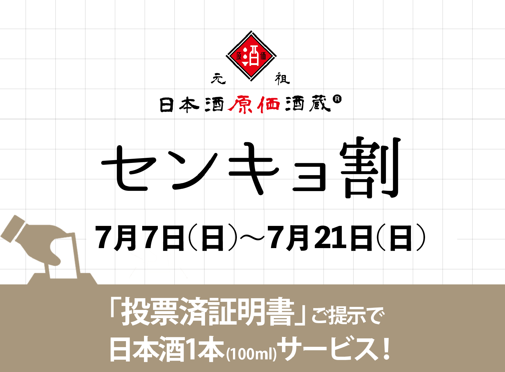 7月7日~7月21日の期間中、投票済証明書提示で日本酒1本(100ml)を無料でご提供致します。