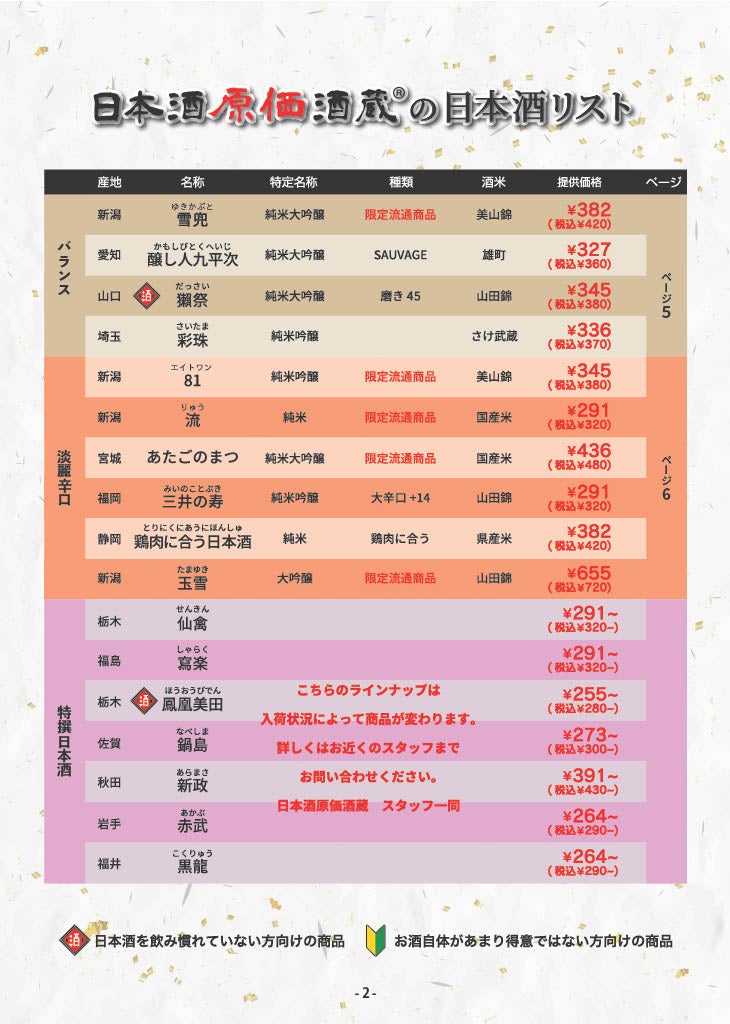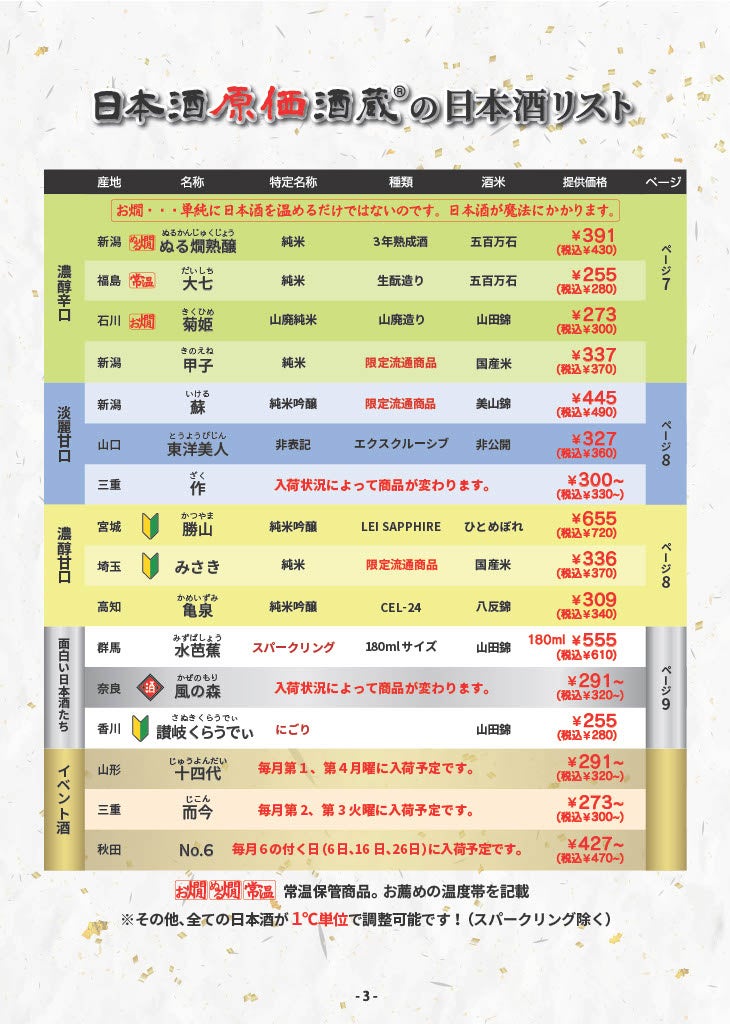 日本酒原価酒蔵メニュー