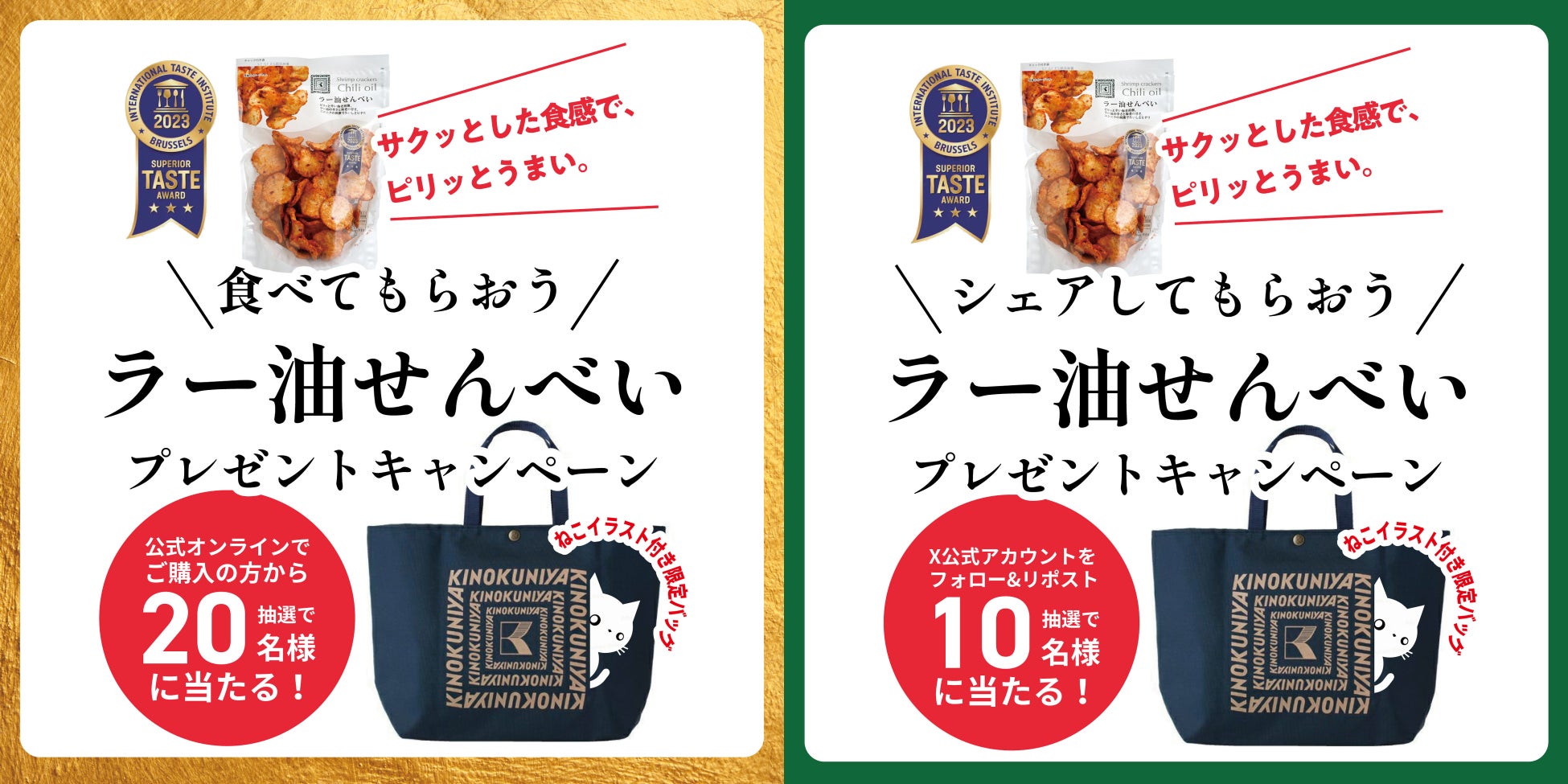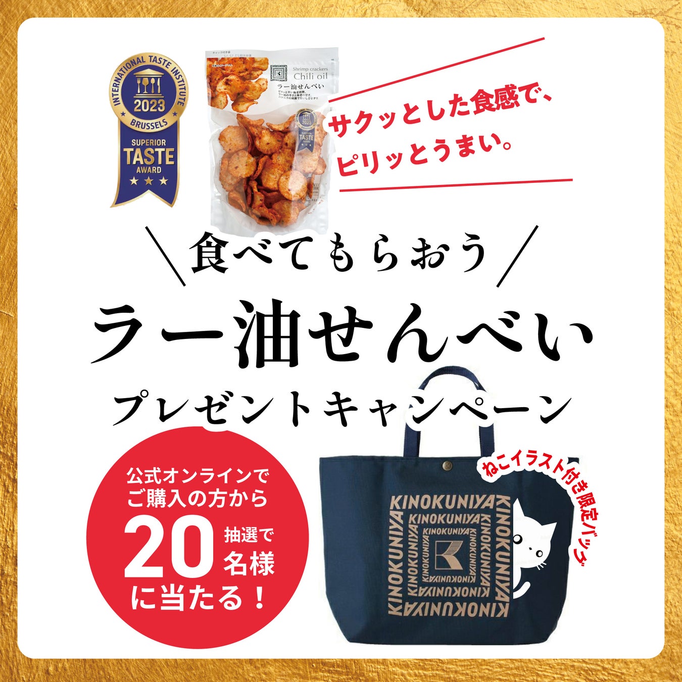 株式会社紀ノ國屋は、5年連続菓子部門売上第一位の「ラー油せんべい(shrimp cracker chili oil)」がInternational Taste Institute (国際味覚機構)の品評会で三つ星★★★を獲得したことを記念して、11月15日 (水) まで、公式オンラインストアと公式X(Twitter)で「ねこのイラスト付き限定エコバッグプレゼントキャンペーン」を開催中です。