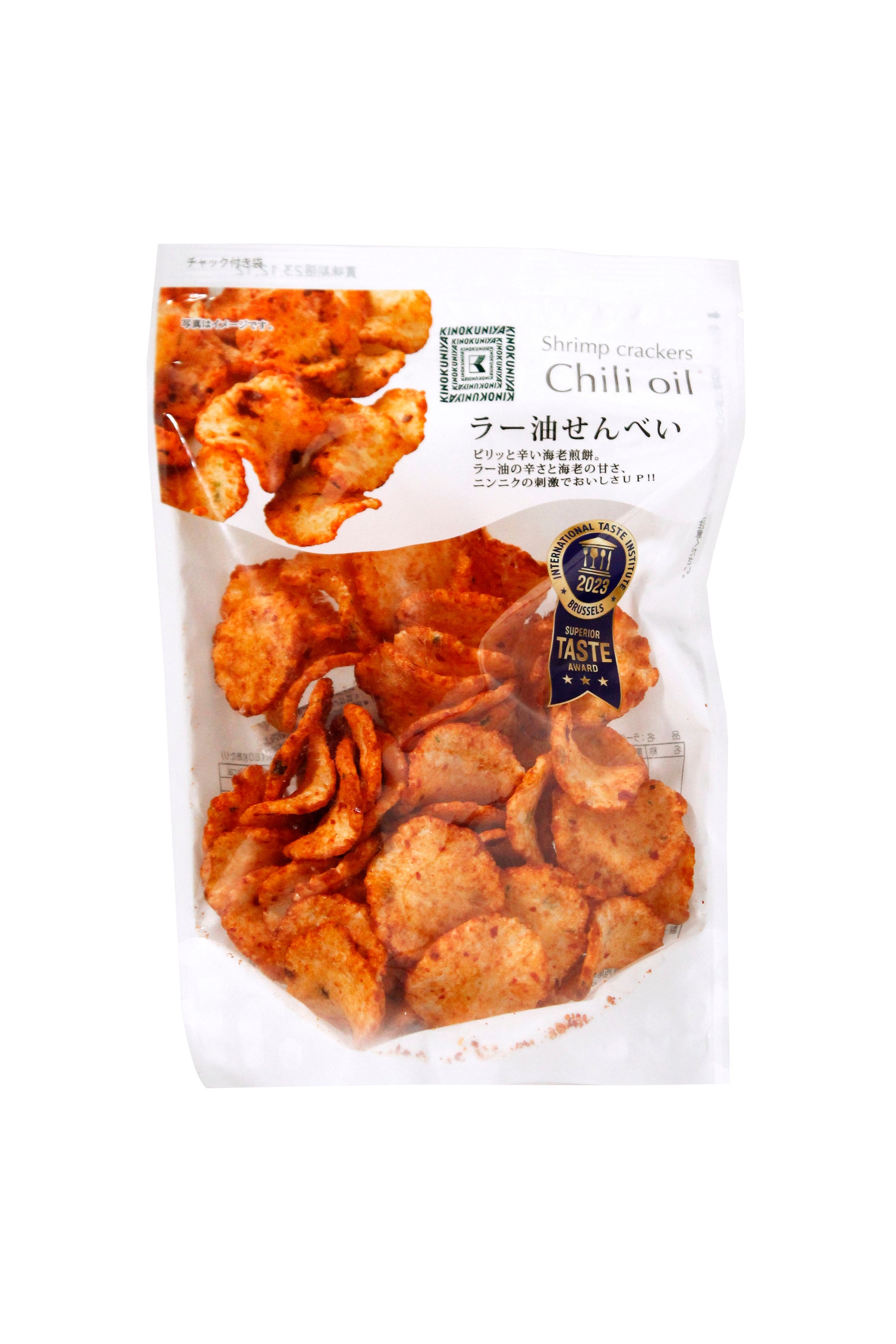 商品特長:ちょっと甘めのえびせんにラー油の辛さと海老の甘さが程良く融合した甘辛な味わいがやみつきになるスナック菓子です。