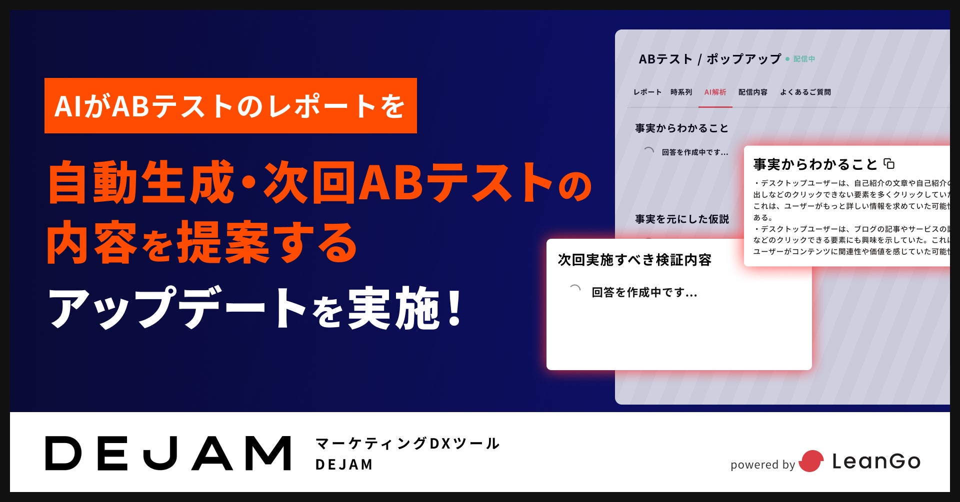 株式会社LeanGo (本社:東京都目黒区、代表取締役:平井 翔吏、以下 弊社) は、自社の運営するマーケティングDXツール「DEJAM( https://leango.co.jp/dejam/ )」でAIがABテストのレポートを自動生成するアップデートを実施したことをお知らせいたします。