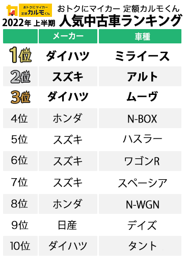 【2022年上半期 中古車カーリース 人気車種ランキング】
