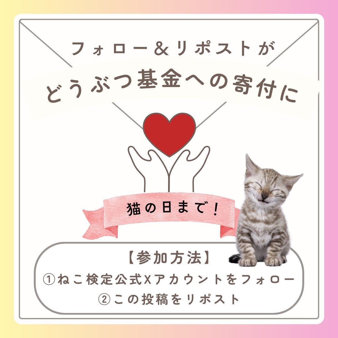 2月22日(土)まで、ねこ検定公式Xにて、1リポストあたり22円を「公益財団法人どうぶつ基金」へ寄付するフォロー&リポストキャンペーンを実施しています。