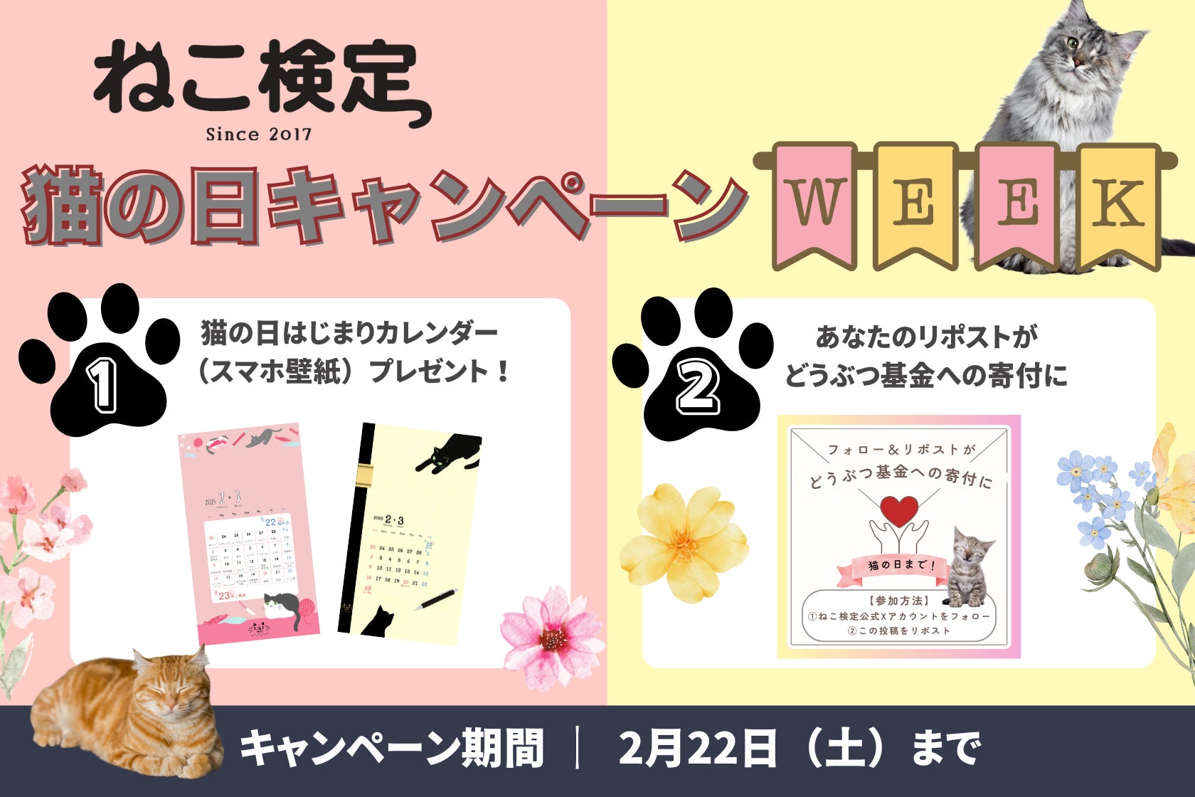 「ねこ検定」に申し込むともれなくオリジナルスマホ壁紙(猫の日はじまりカレンダー)2種をプレゼント!あなたのリポストがどうぶつ基金への寄付になるキャンペーンも。