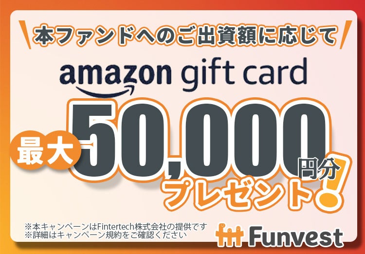 本ファンドへ出資していただいた投資家の皆様を対象として、出資額に応じて最大50,000円分のAmazonギフトカードをプレゼントするキャンペーンも併せて実施いたします。