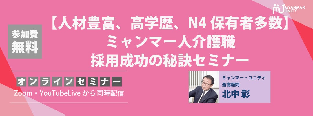 そのような中で、今回ミャンマー政府認定No.1人材送り出し機関「ミャンマー・ユニティ」は、8月30日に【人材豊富、高学歴、N4保有者多数】ミャンマー人介護職採用成功の秘訣セミナーを開催いたします。