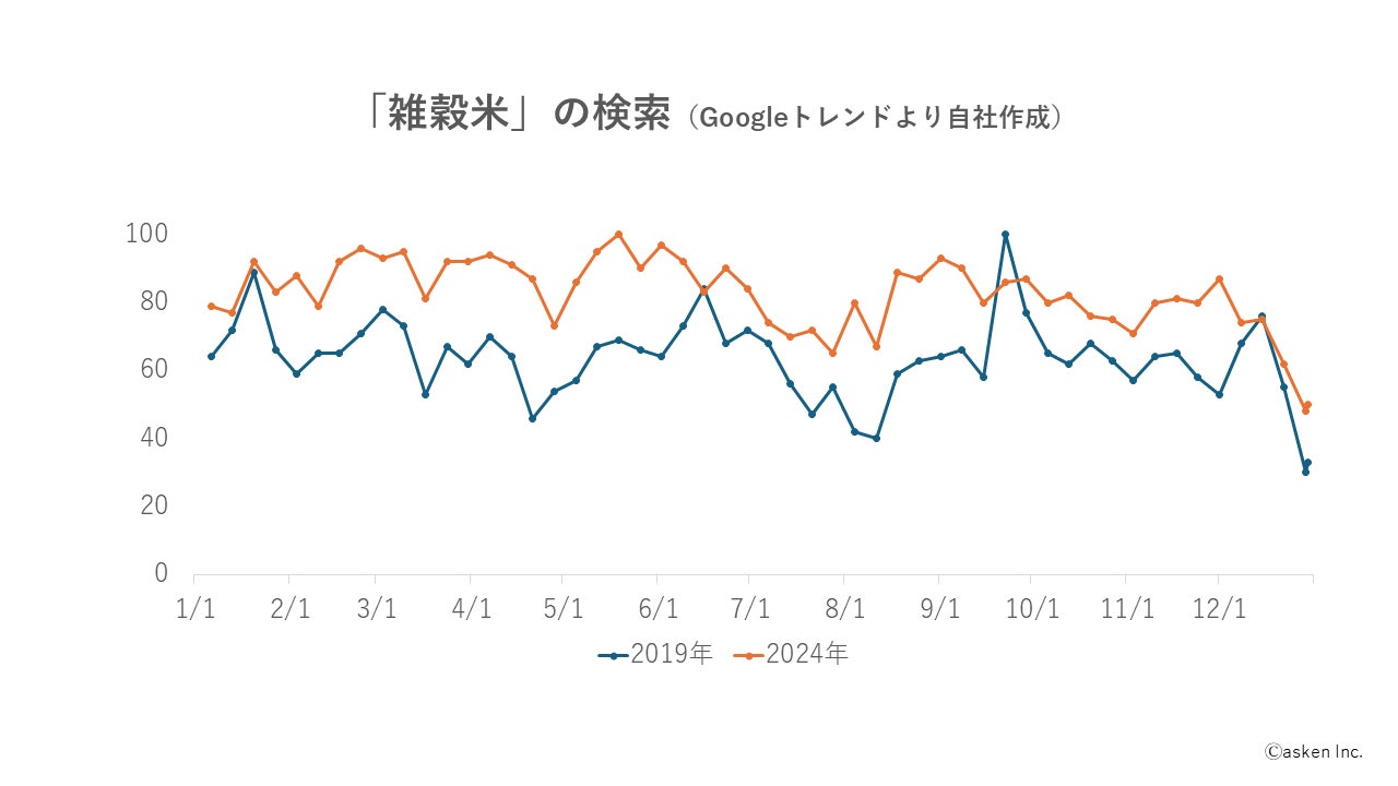 Google LLCが提供する、ユーザーが何を検索しているかを確認できるツール「Google トレンド™ ツール」からも、「雑穀米」はコロナ禍前の2019年よりも2024年の方が、注目度が高まっていることが伺えました。(抽出日:2025年1月17日)