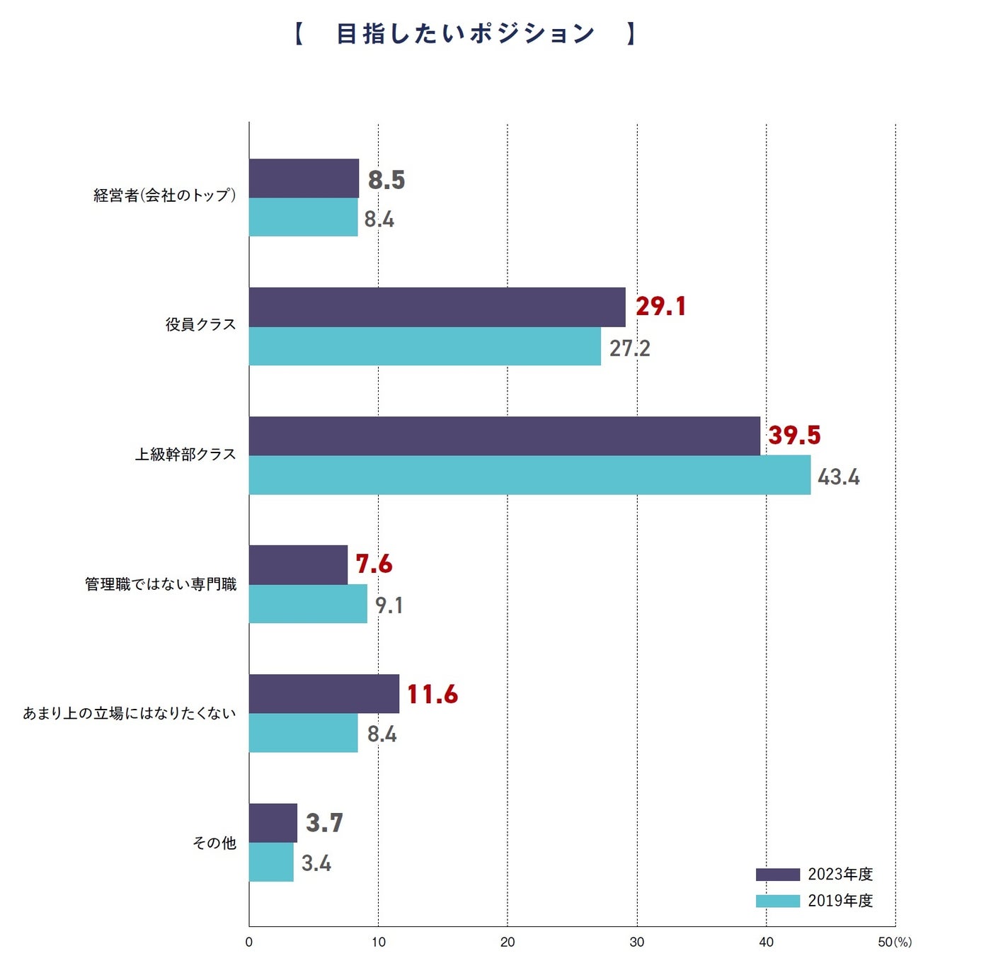 目指したいポジションについて尋ねたところ、「上級幹部クラス」(39.5%)が最も多く、次いで「役員クラス」(29.1%)となりました。2019年度と比して「上級幹部クラス」は減少している一方、「役員クラス」は増加していることが見て取れます。