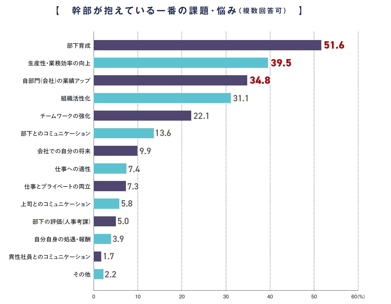 幹部が抱えている一番の課題・悩みについて尋ねると、「部下育成」(51.6%)が半数以上と最多となり、次いで「生産性・業務効率の向上」(39.5%)、「自部門(会社)の業績アップ」(34.8%)という結果に。また、「組織活性化」(31.1%)、「チームワークの強化」(22.1%)、「部下とのコミュニケーション」(13.6%)も上位に入るなど、組織活性化のために社員のモチベーション向上やチームビルディングの醸成が求められていることがうかがえます。