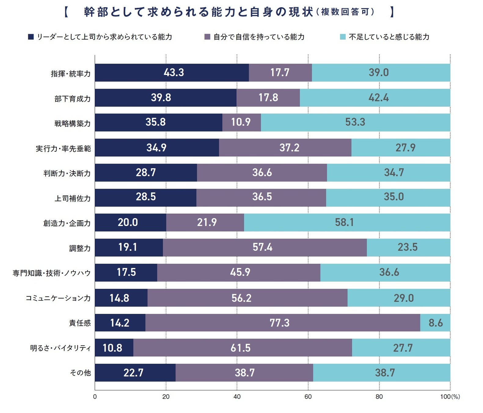 また、不足していると感じる能力では、「創造力・企画力」(58.1%)が最多となり、次いで「戦略構築力」(53.3%)「部下育成力」(42.4%)という結果に。多くの幹部が課題として感じていることがうかがえます。