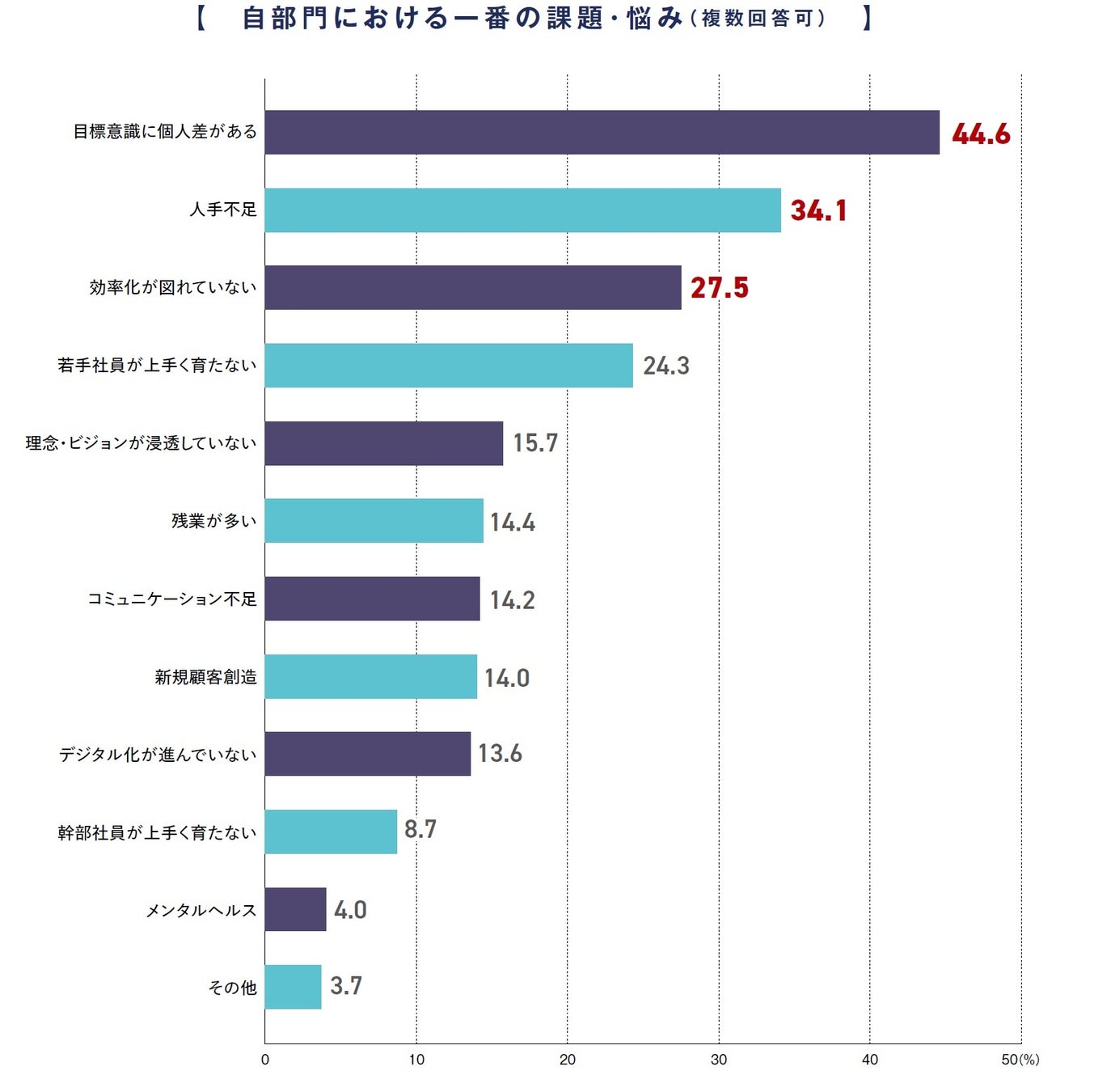 ■自部門における一番の課題・悩みは、4割以上が「目標意識に個人差がある」と回答。