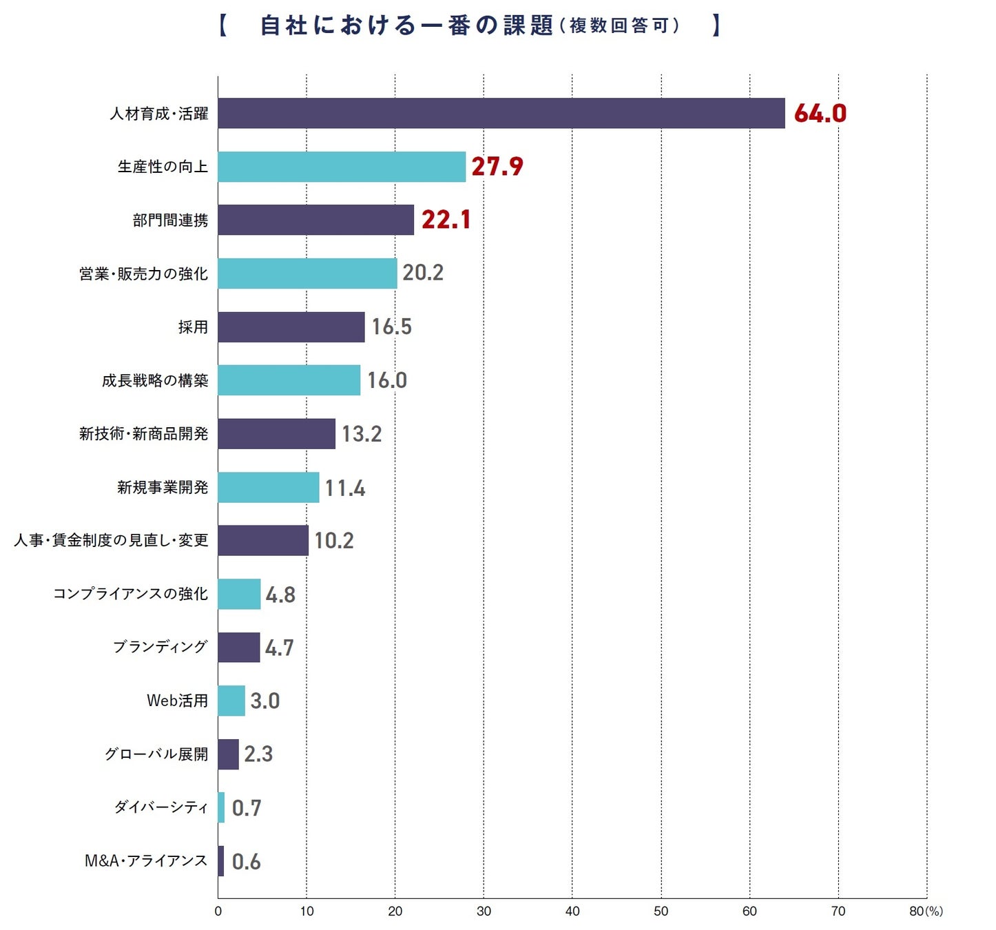 自社における課題について尋ねたところ、「人材育成・活躍」(64.0%)が最多となり、二番目の「生産性の向上」(27.9%)と倍以上の差をつけ圧倒的に多い結果となりました。
