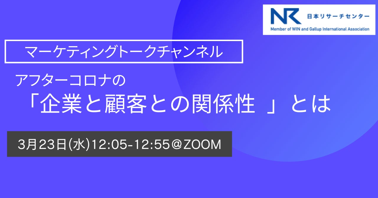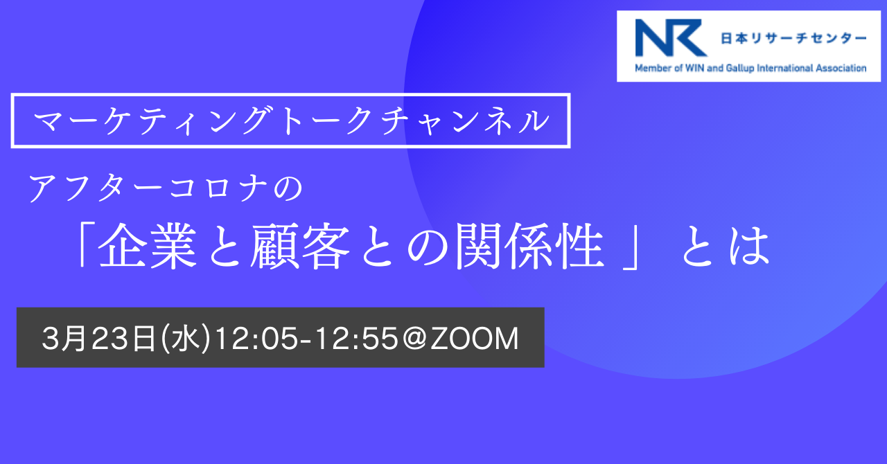 日本リサーチセンター(本社:東京都、代表取締役社長:杉原領治)は、1960年に設立された民間のマーケティング・リサーチ会社であり、民間企業および官公庁、大学をはじめとする学術機関などの依頼を受け、各種の調査研究をおこなっています。この度、 3月23日(水)12:05から「企業と顧客との関係性」をテーマとして、オンラインウェビナーを開催いたします