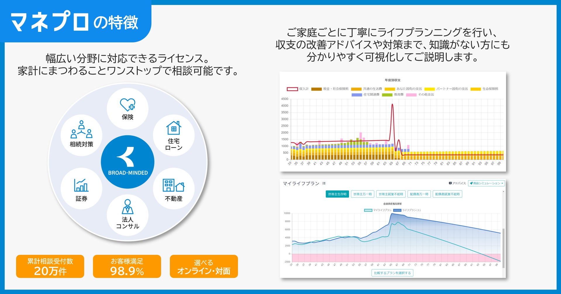 利用者数3万件を超える、FP(ファイナンシャルプランナー)などプロ向けライフプランシミュレーター「マネパス」のロジックを活用。当社のFPはもちろん、「マネパス」は他の金融サービス事業者のコンサルティングツールとして採用されており、その本格的な計算エンジンにより高精度なシミュレーションを提供します。