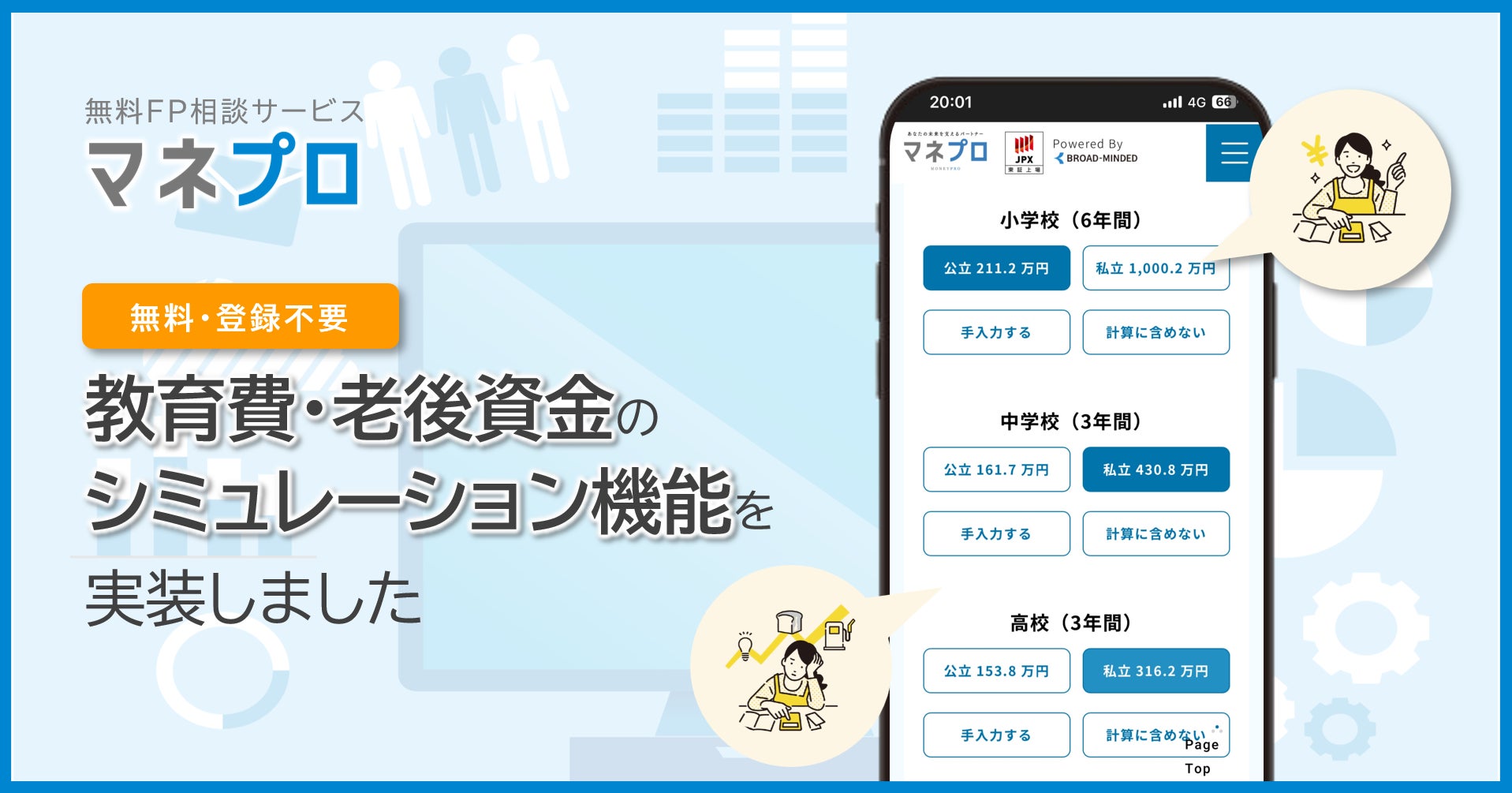 「金融の力を解き放つ」というパーパスのもと、ライフプラン実現を支援する金融サービスを開発・提供するブロードマインド株式会社(本社:東京都渋谷区 代表取締役社長:伊藤清 証券コード:7343 以下:当社)は、FP相談サービス『マネプロ』において、このたび教育費・老後資金に特化したシミュレーション機能をブランドサイトに新たに追加いたしました。