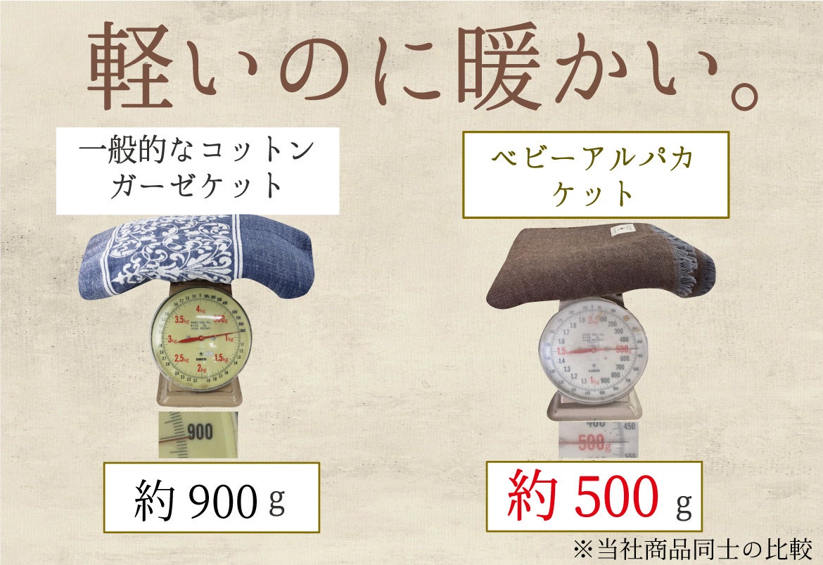 一般的なコットンガーゼケットと比べるとこんなにちがいます!ベビーアルパカケットで軽いのに暖かいが実現。