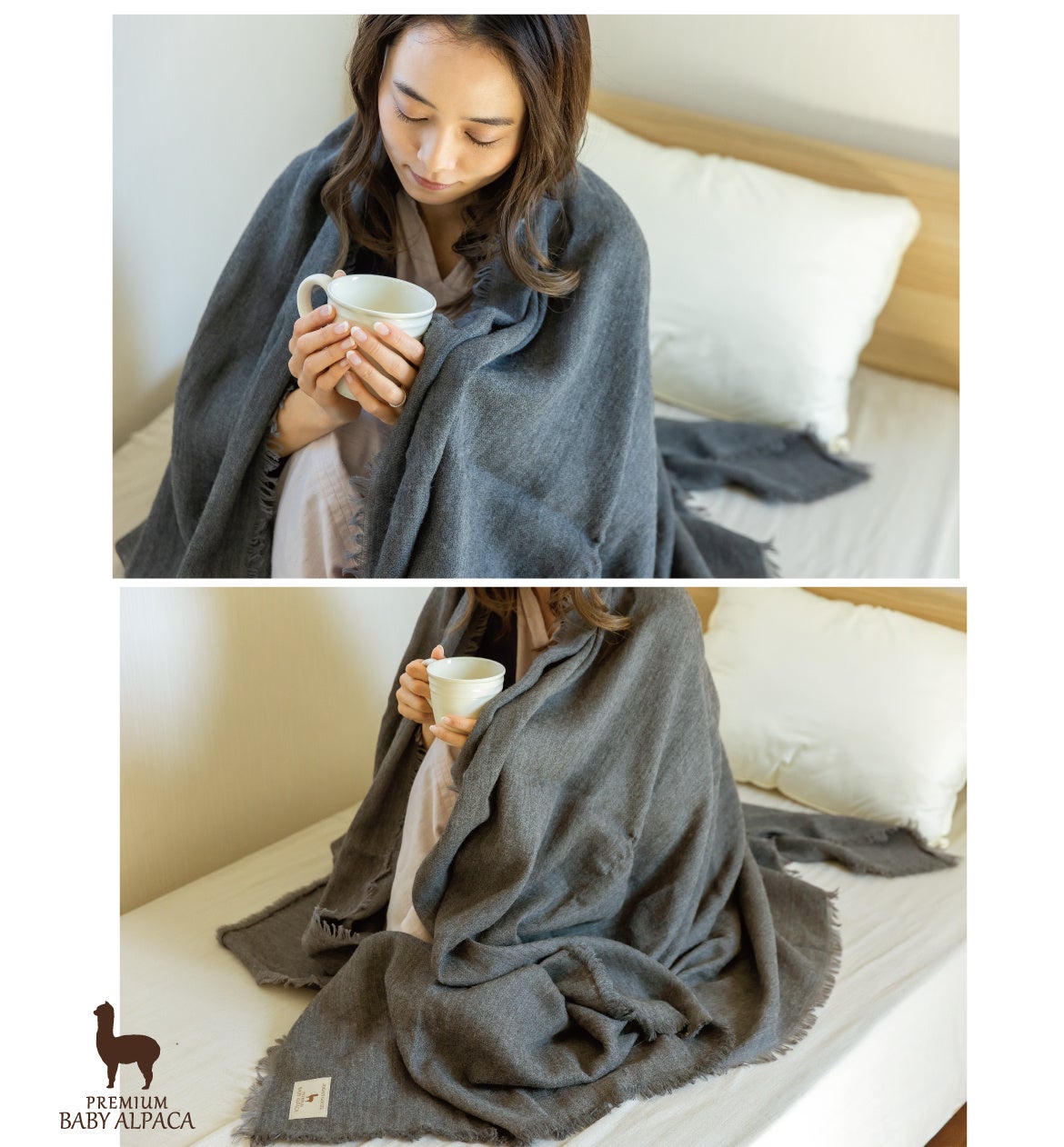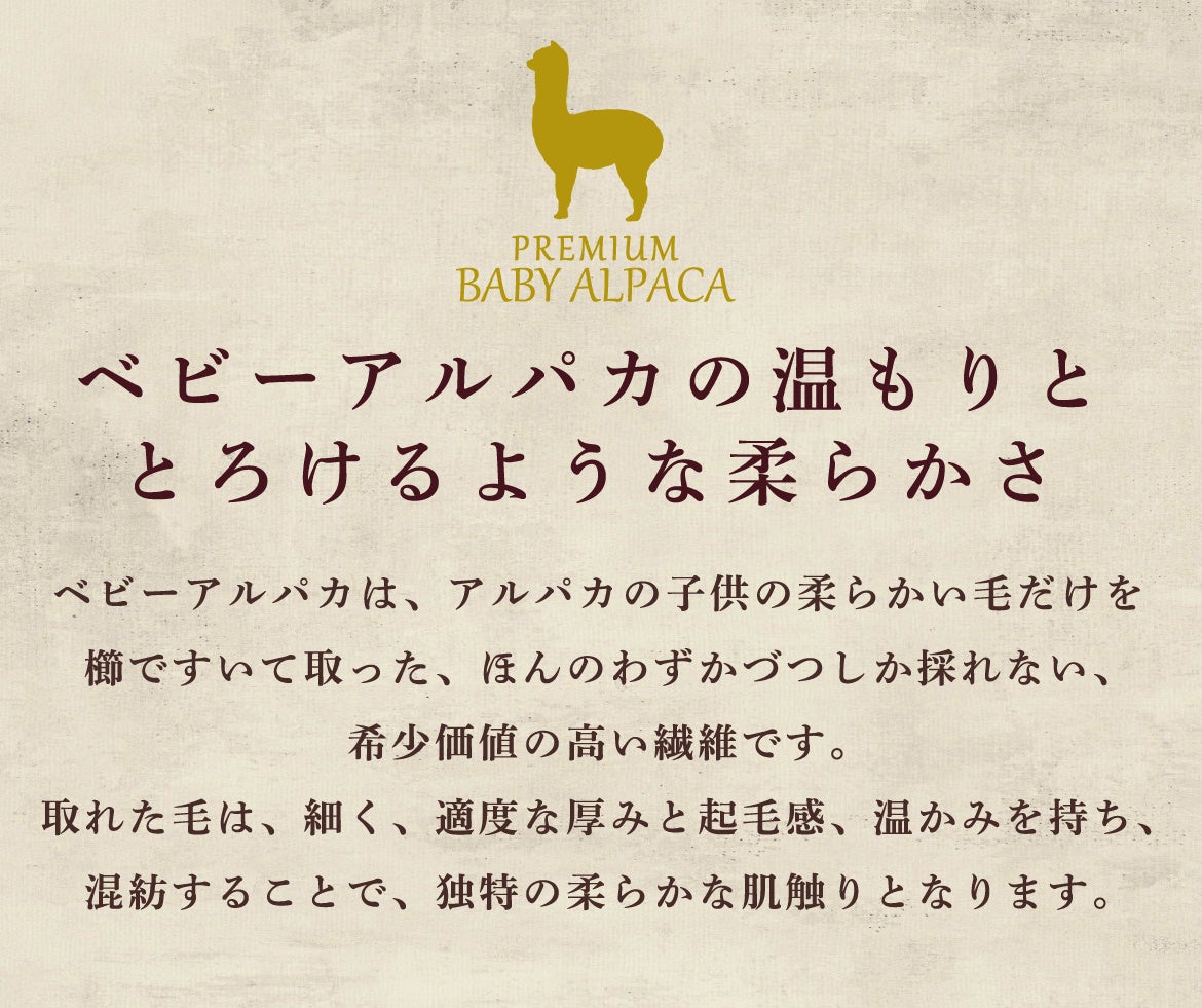 冬の防寒用にぴったりなアルパカは、やさしく体を包み、身も心もじんわりと暖かくご使用いただけます