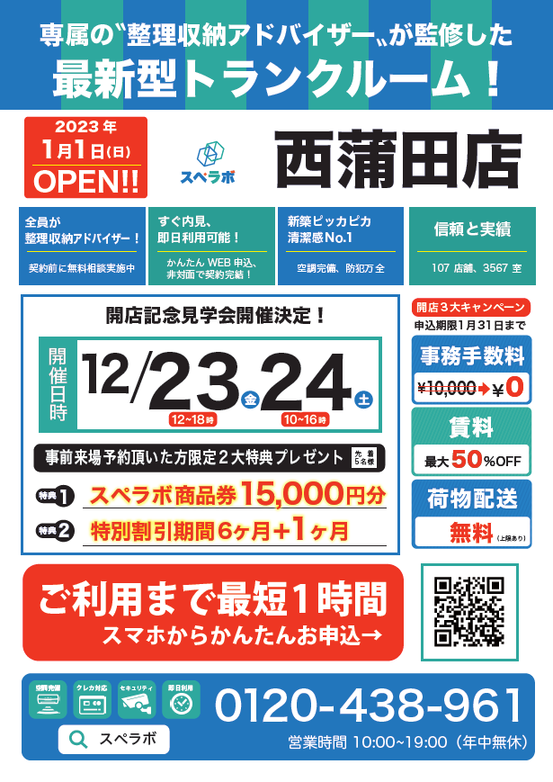 【西蒲田店/1月1日(日)オープン】見学から契約、解約まで完全非接触・非対面、お申し込みからご利用まで最短1時間!都内、大阪などにて絶賛運営中のトランクルーム【スペラボ】が西蒲田に出店!