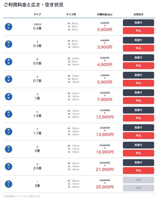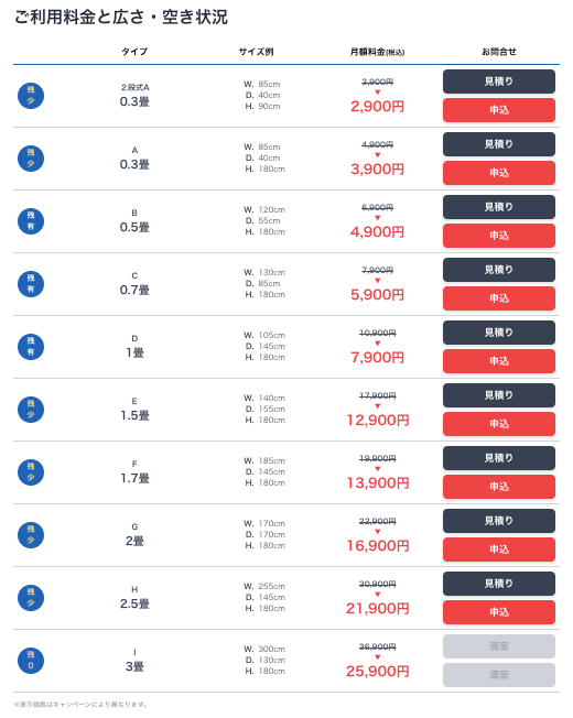 - 部屋タイプとサイズ、月額料金はこちら
