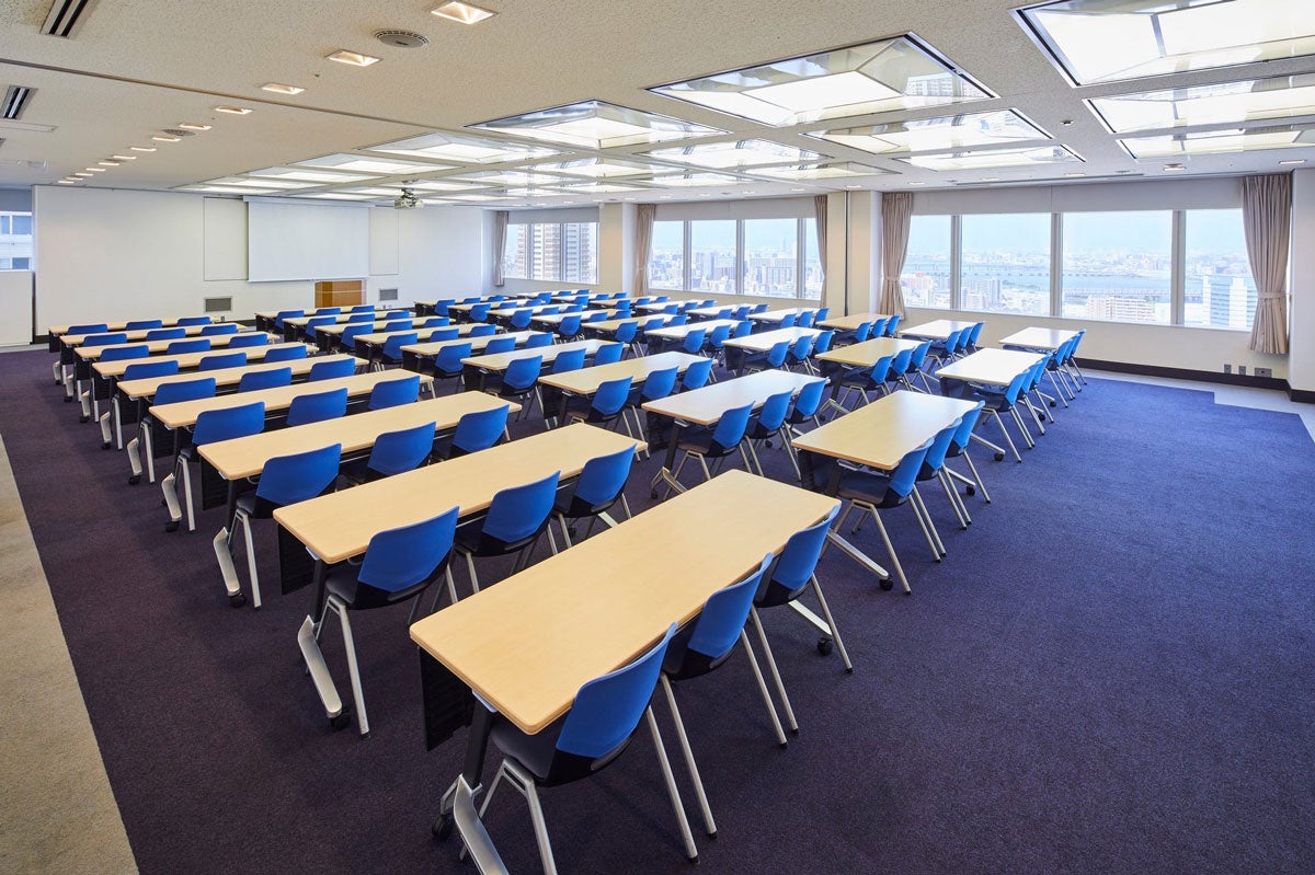 全室に窓があり、開放感あふれる貸会議室は、梅田周辺の高層ビル群や淀川対岸の街並みを一望できる眺望が魅力。自由なレイアウトが可能で、会議やセミナー後の懇親会、展示会の商談スペースも同じフロア内でご利用いただけるため、来場者の移動もスムーズです。