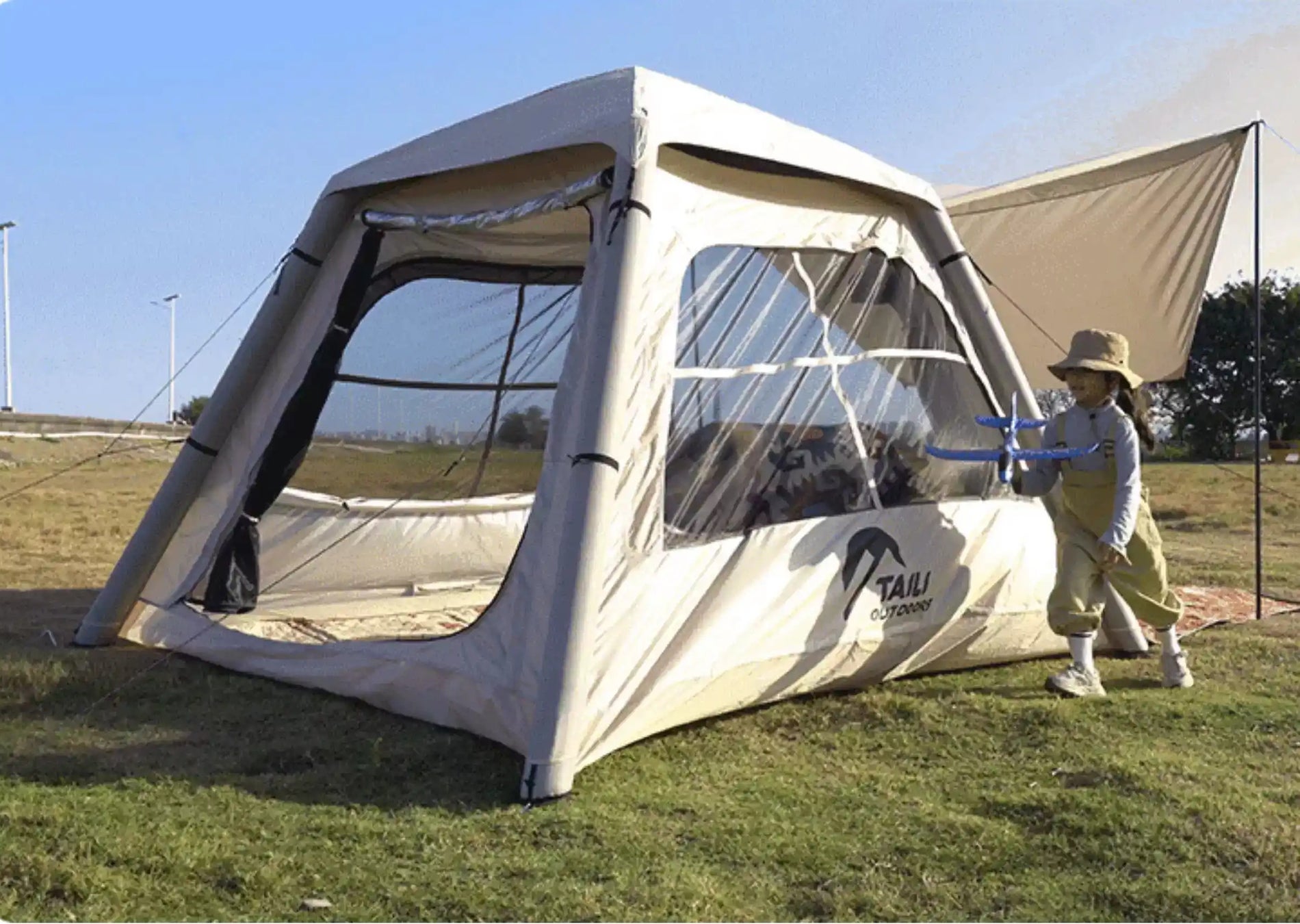 TAILIエアテントは、設計が精巧な「空気の建築物」として、優雅な空間をそっと包み込みます。空気の力で突如現れる建築。家のような外観のベージュ系テントは、どんな場所でも柔らかく風景に溶け合います。