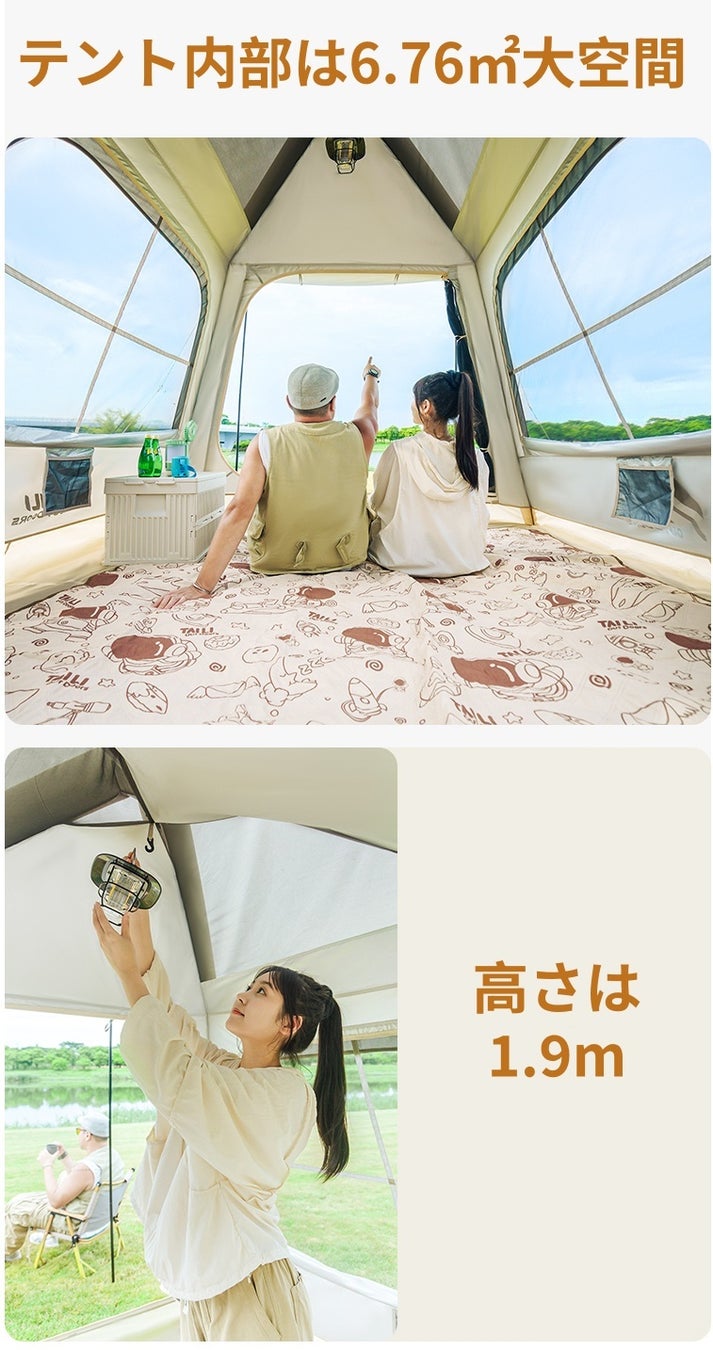 TAILIエアテントは内部空間が広く設計されており、複数人で使用しても窮屈さを感じることがなく、ゆったりとした休憩や活動が可能です。