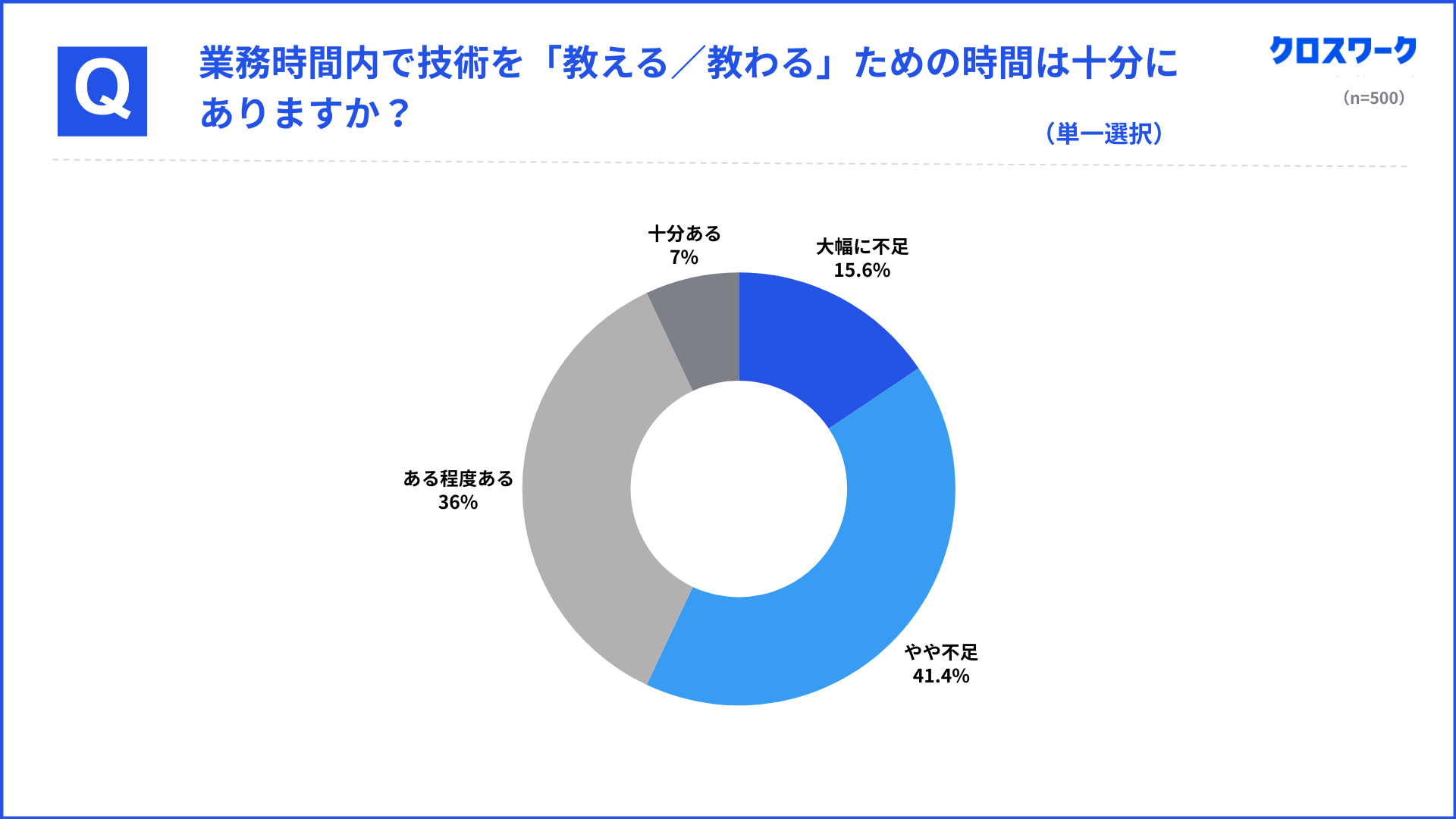 技術を「教える・教わる」ための時間が業務時間内に確保されているかについては、「大幅に不足」「やや不足」と回答した人が57.0%にのぼりました。