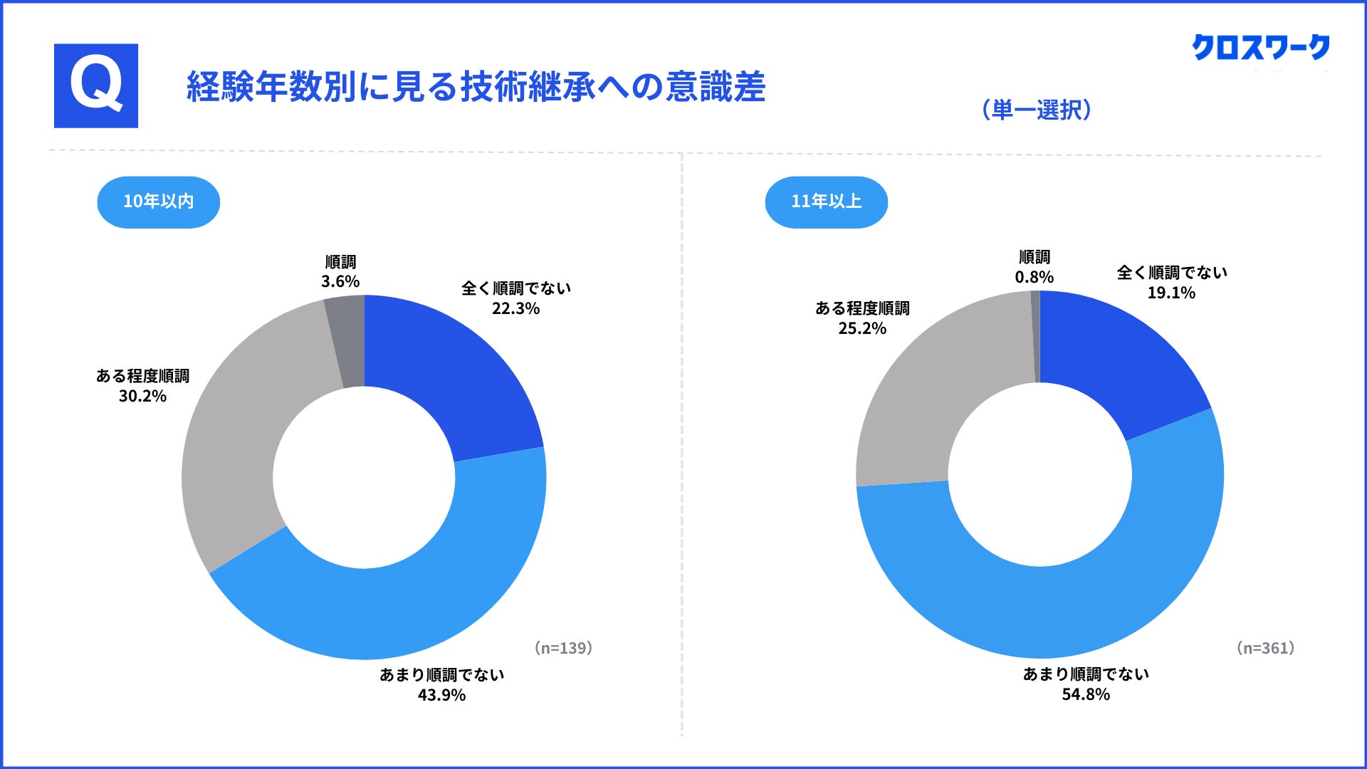 特に経験年数が長い層ほど危機感が強く、11〜20年の中堅層や21年以上のベテラン層では、74%が技術継承が順調に進んでいないと答えています。