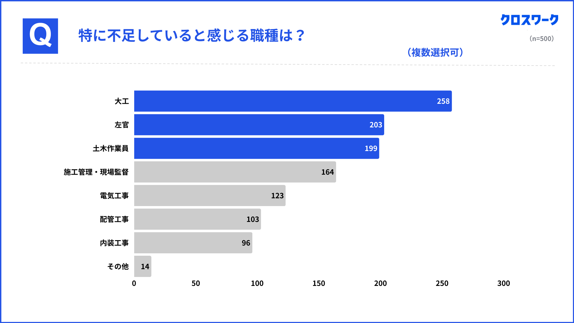 建設現場で働く人の83.8%が、 人手不足を「強く実感」「やや実感」していると回答しました。 特に不足している職種としては大工(258人、51.6%)、左官(203人、40.6%)、土木作業員(199人、39.8%)、施工管理・現場監督に多くの回答が集まりました。