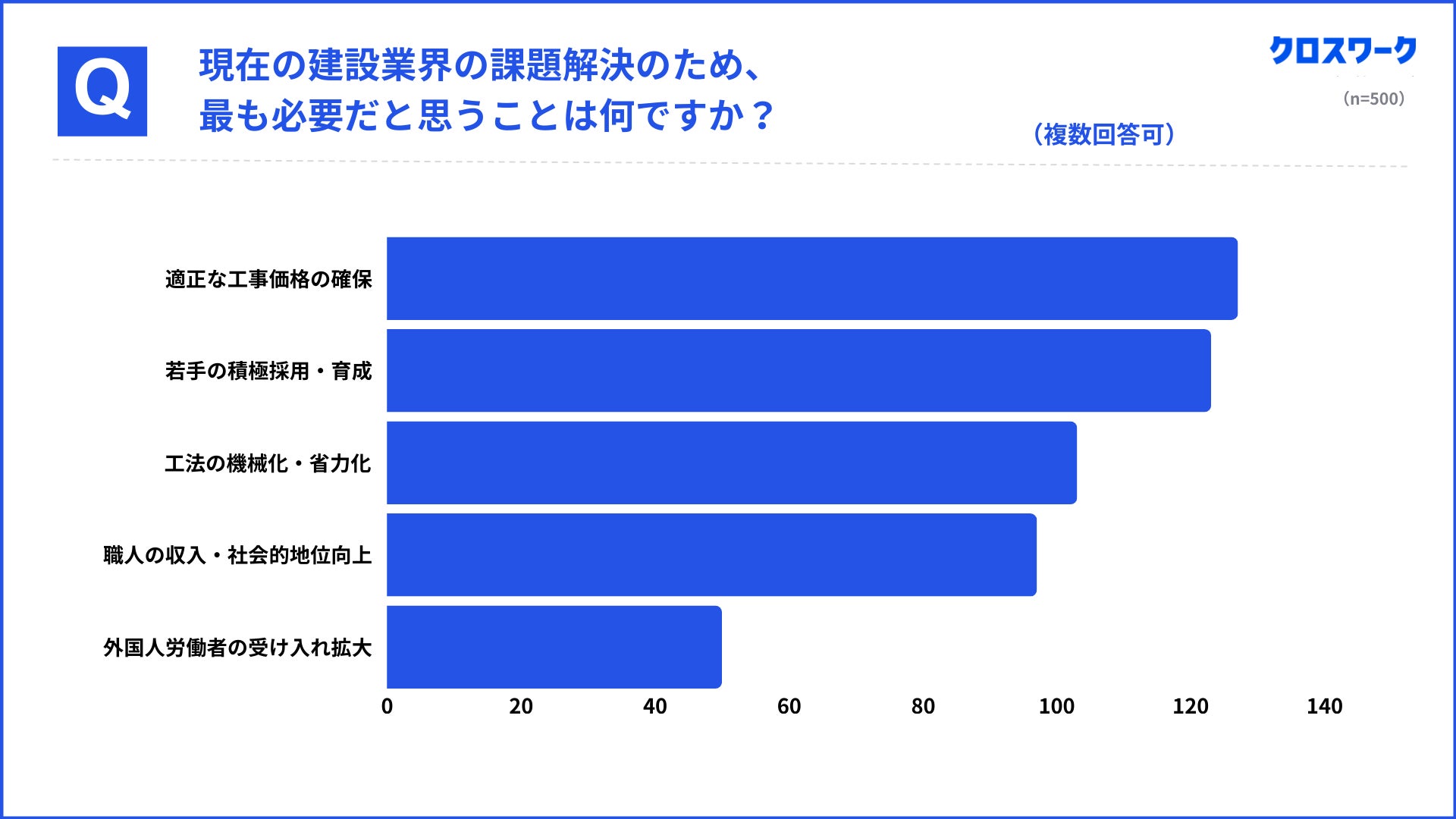 業界課題の解決策として最も多かった回答は「適正な工事価格の確保」(127人、25.4%)でした。次いで「若手の積極採用・育成」(123人、24.6%)、「103人、工法の機械化・省力化」(20.6%)が続きます。一方で、外国人労働者の受け入れ拡充と答えた人は10%にとどまりました。