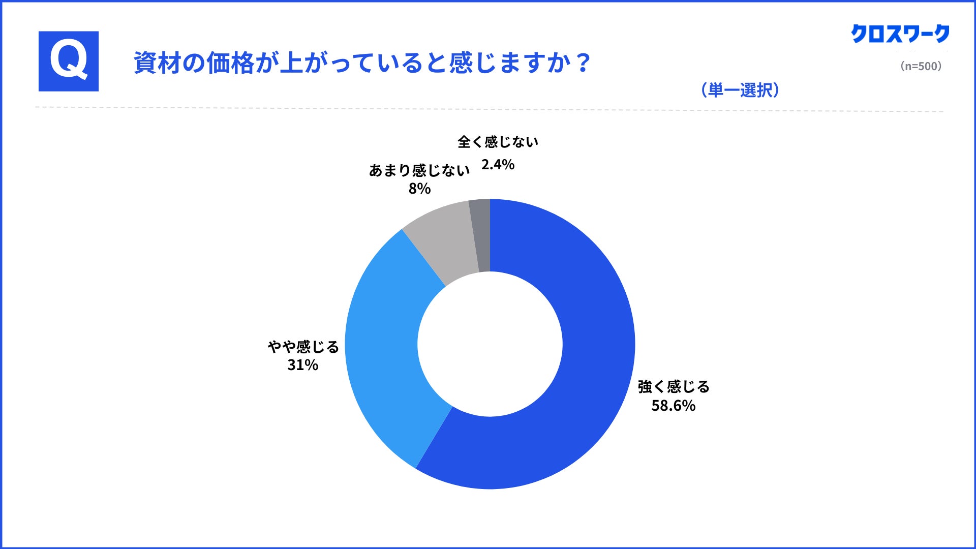 資材価格の高騰を「感じる」と回答したのは89.6%にのぼりました。合わせて資材高騰の影響も聞いたところ、人件費の増加、代替資材の使用、調整の工数増加などが挙がりました。