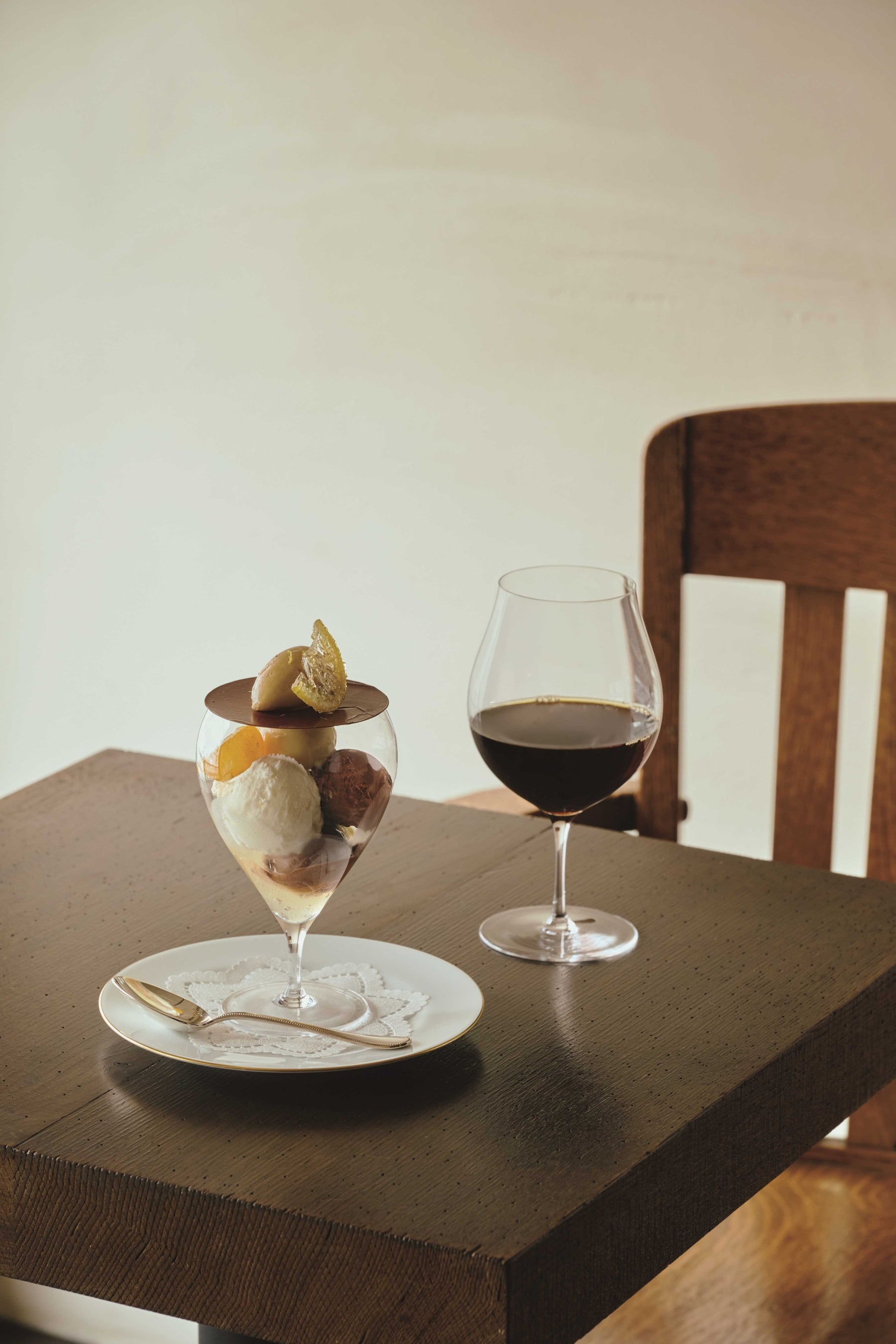 薔薇と苺を主役に、燻製ショコラで味わいの幅を持たせた美しいパフェ。そこに合わせるのは、甘み、渋み、香ばしさ、旨味が重なり合う、深みのあるブレンドティーです。幾重もの香りのレイヤーが魅せる、華やかな世界をお楽しみください。